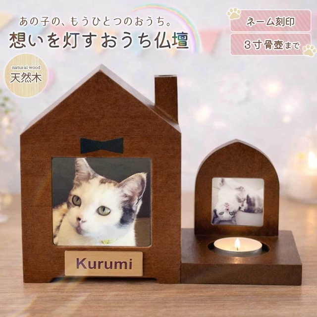 名入れ ペット仏壇 おうち型 仏壇 メモリアル 家型 木製 写真フレーム付き ハウス型 三角屋根 ミニ仏壇 ペット 家族 思い出 遺骨 骨壺 遺灰 遺毛 分骨 形見 位牌 供養 仏具 祭壇 愛犬 愛猫 犬 猫 うさぎ ハムスター 小鳥 文鳥 インコ フェレット ハリネズミ 小動物 虹の橋 ペット供養 癒し 命日 お盆 彼岸 お悔み メモリアルグッズ コンパクト ナチュラルインテリア 遺品整理 手元供養 お供え 仏間 寝室 リビング 玄関 書斎 【本体サイズ】 外寸:高さ約17cm × 幅約12cm × 奥行約12cm 内寸:高さ約13.5cm × 幅約10cm × 奥行約10cm 【付属フォトスタンドサイズ】 高さ約10.5cm × 幅約8cm × 奥行約9cm 【写真フレームサイズ】 大:約7 × 7cm 小:約4.2 × 4.2cm 【ネームプレートカラー】 ゴールド/ローズゴールド *1カラーのお値段です *許容範囲誤差±0.5cmです 素材:木製 【収納可能サイズ目安】 本製品は3寸骨壺以内のサイズに対応しています。 *骨壺袋のサイズや形状によっては、袋ごと収納できない場合がございます。ご購入前にお手元の骨壺サイズをご確認ください。 対応するペットの目安 ・2寸骨壷:【小動物】ハムスター/リス/モモンガ/小鳥 など ・2.5寸骨壷:【小動物】フェレット/プレーリードッグ など ・3寸骨壷:【小動物】子猫/子犬/兎(ウサギ) など ※本製品は手元供養用の小型仏壇です。また、防水仕様ではありませんので、納骨堂や屋外での保管には適しておりません。 ※ろうそくなどの火を扱う場合は必ず目を離さず、安全にご使用ください。 ※天然木を使用しているため、木目・節・小さな傷・色味の個体差などがございます。あらかじめご了承ください。 ※海外製造品のため、接合部の微細なすき間や塗装ムラなど、多少の加工の粗さがある場合がございます。 ※湿気が多い場所や直射日光が当たる環境での保管は、木材の変形・変色・カビ発生などの原因となります。 ※遺骨を直接納める場合は、湿気対策として乾燥剤の併用をおすすめします。 ※遺品(首輪・写真・毛・おもちゃなど)を収納する際は、熱や湿気を避け、清潔な状態で保管してください。 ※宗教的効力や霊的効果を保証するものではなく、心を込めた手元供養・メモリアルとしてご使用ください。 大切な家族との思い出を―― 温もりのある木製デザインが魅力の【おうち型ペット仏壇】です。 写真フレーム付きで、愛するペットの姿をいつでも近くに感じられるメモリアルアイテム。ナチュラルでインテリアになじむデザインは、リビングや寝室にも自然に溶け込みます。 小さな「おうち」をイメージしたフォルムは、虹の橋を渡ったあの子の“もうひとつのお家”。心を込めてお祈りしたい時、静かに手を合わせる時間を優しく包み込みます。香立てやおりん、ろうそく立てなどを一緒に飾ってもバランスよくまとまるサイズ感です。 写真立て部分にはお気に入りの1枚を飾ることができ、毎日の「おはよう」「おやすみ」が自然に生まれる空間に。骨壺のほか首輪やおもちゃなどの遺品・愛用品の収納用としても。お花やキャンドル、遺骨カプセル、位牌なども自由にレイアウト可能。犬・猫をはじめ、小鳥・うさぎ・ハムスターなど、大切なペットのメモリアルにご使用いただけます。 木製ならではのあたたかみと、シンプルでやさしいデザイン。宗教や形式にとらわれず、心を込めて供養したい方にぴったりです。 【名入れ・刻印について】 ☆☆ 名入れ・メッセージ刻印 ご希望のお客様へ ☆☆ ご注文時、備考欄に刻印したい内容をご記入ください。 ※刻印はレーザー加工によるため、刻印時の環境や素材の状態により、濃さ・色味・太さなどにムラが生じる場合がございます。 ※複数点ご購入の場合、同一条件であっても刻印の色味・濃淡・仕上がりが完全に同じになることはございません。 本商品は一点一点仕上がりが異なる一点ものとなります。 ※刻印の色味・濃さ・太さの指定や再現、仕上がり差による交換・返品はお受けできませんので、あらかじめご了承ください。 ・刻印内容:1行のみ ・文字数:全角半角8文字まで ・対応文字:アルファベット/ひらがな/カタカナ ・書体:ゴシック体 ※文字の大きさは文字数によって調整させていただきます。 ※文字数が多い場合は、全体の収まりを優先し、文字サイズが小さくなる場合がございます。 ※文字サイズの指定や微調整のご要望には対応できませんので、あらかじめご了承ください。 ※記載内容に不備がある場合、確認のため発送が遅れる場合がございます。 ●PCモニターの色彩具合などにより、色の見え方に違いがある場合がございます。 ●色違い、商品違い、大きな欠陥の場合は、到着後3日以内にご連絡下さい。 ●生産時期によってデザインが若干異なる場合がございます。予めご了承ください。 ●色やサイズがお気に召さないなどの交換、イメージと違った等による返品は未開封の商品でもお受け出来ません。 内祝 内祝い 結婚 出産 香典 快気 結婚内祝い 出産内祝い 香典返し 誕生日 引出