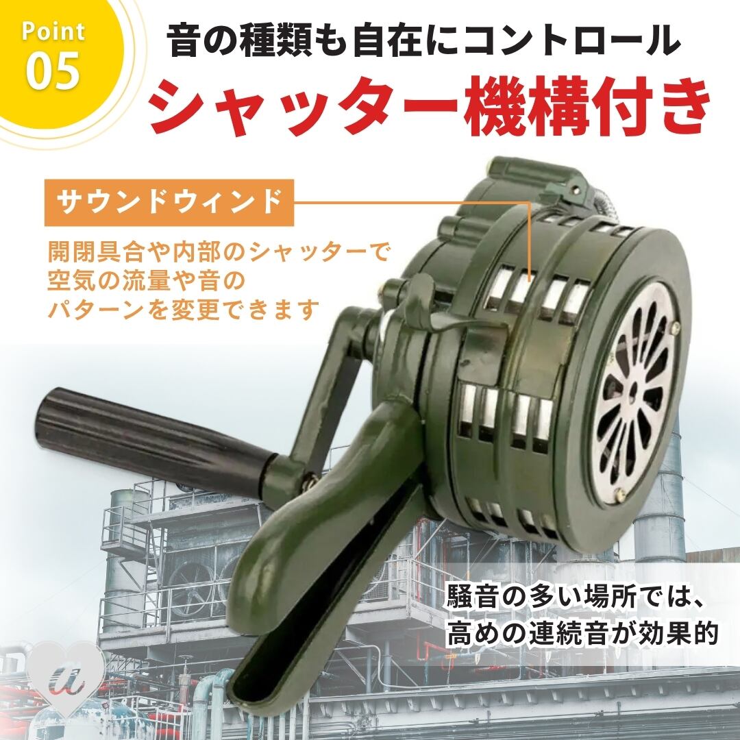 ※本製品は災害や緊急時に周囲へ注意を促すための手動式ホーンですが、あらゆる状況において必ずしも防災の保証、周囲へ通知できることを保証するものではございません。ご使用環境や周囲の状況により、音の届き方に差が生じる場合がございますので、あらかじめご了承ください。