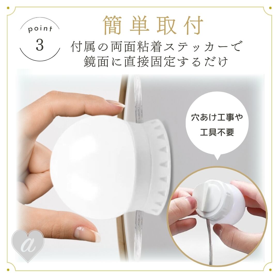 各電球間のワイヤーの長さは、必要に応じて電球を回転させるかワイヤーを引くことで調整でき、さまざまなサイズや形状のミラーに対応できます。使いやすいUSBケーブルが装備されており、ラップトップ、携帯充電器、モバイルバッテリー、その他USBポートから簡単に電源を供給できます