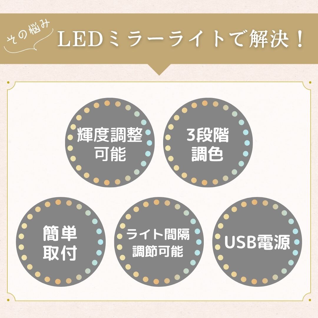 ミラー装飾 メイクアップミラーランプ ハリウッドミラーライト LEDライト 10球 USB 高輝度 輝度調整 3段階調色 明るさ調節可 取り付け簡単 長さ調節可 穴開け不要 工具不要 照明 女優ライト LEDミラーライト メイクアップライト LED ミラーライト
