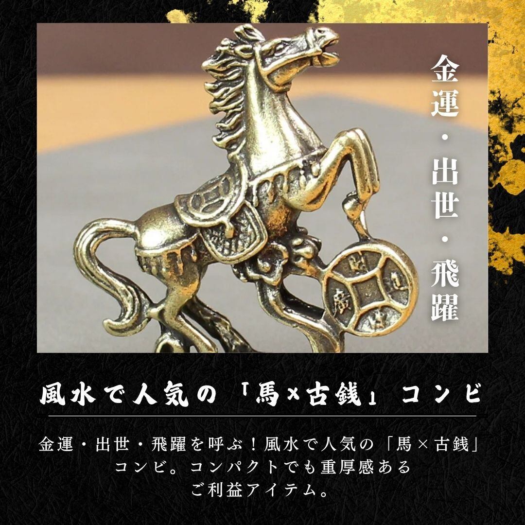 馬は風水において「前進」「財運」「勝負運」を司るとされ、人生の飛躍やチャンスを呼び込むラッキーアニマル。また、古銭モチーフは「財を呼び込む」象徴として、金運や財産運アップをサポートします。
