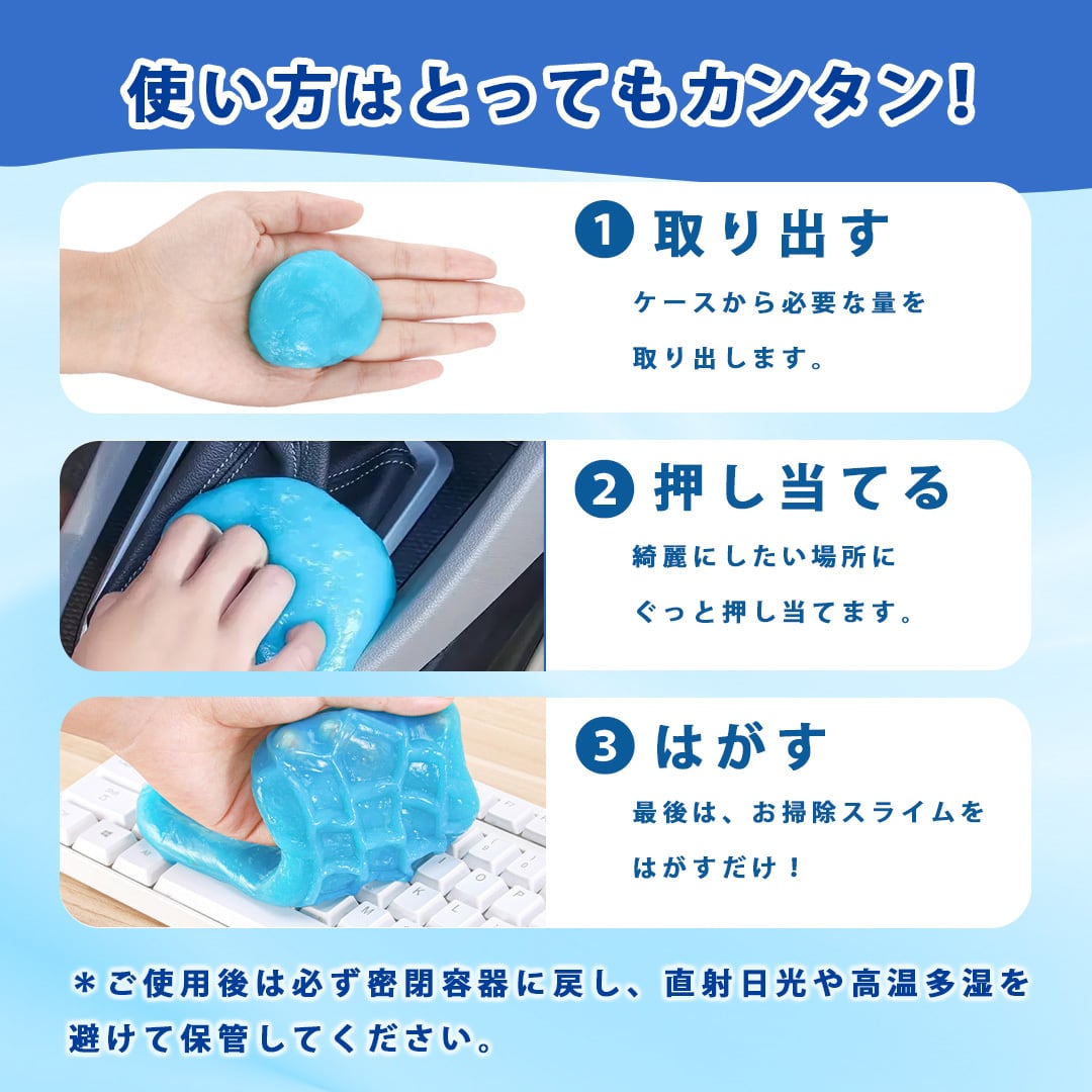 ※使用後は必ず密閉容器に戻して保管してください。またスライムが黒ずんできたら新しいものに交換してください。水洗い不可。繰り返し使用できますが、衛生面を考慮して定期的な交換をおすすめします。