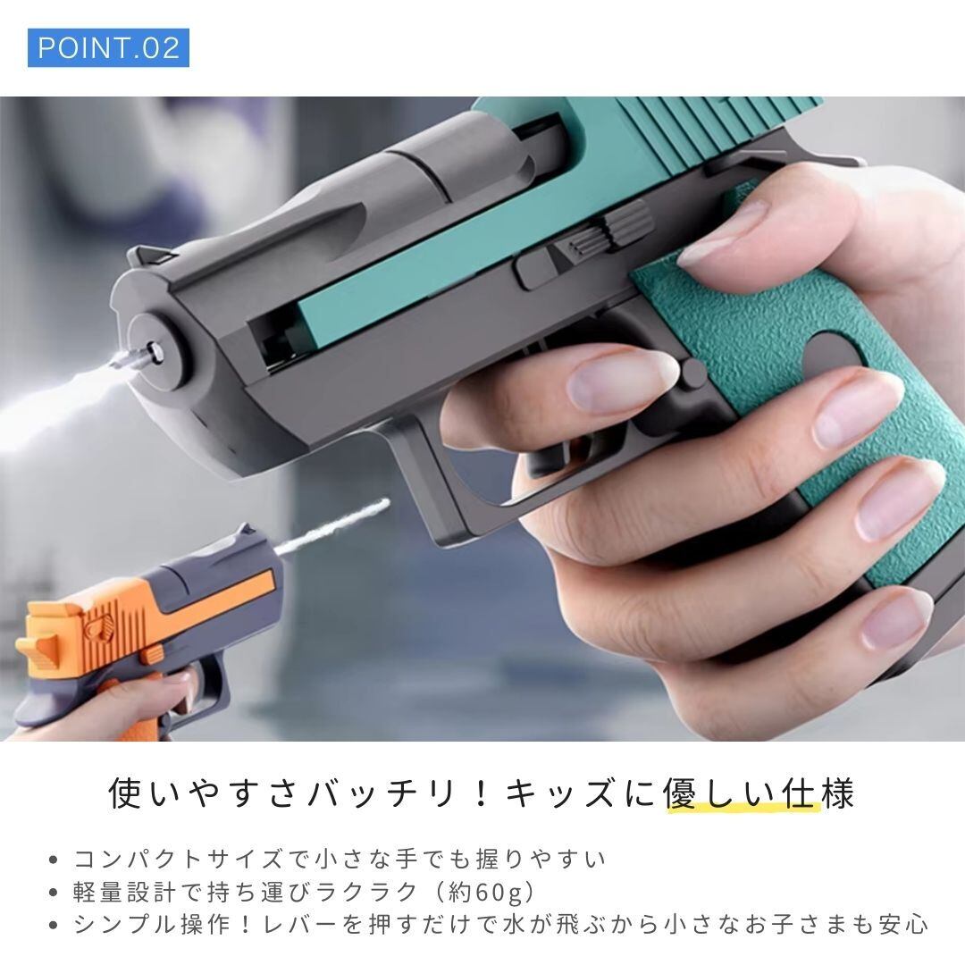 リアルなデザインが魅力の水鉄砲は、お子様から大人まで楽しめる本格派ウォーターガンです。手動式で電池不要。水を入れて引き金を引くだけの簡単操作で、遠くまで水が飛び出す爽快なアクションが楽しめます。