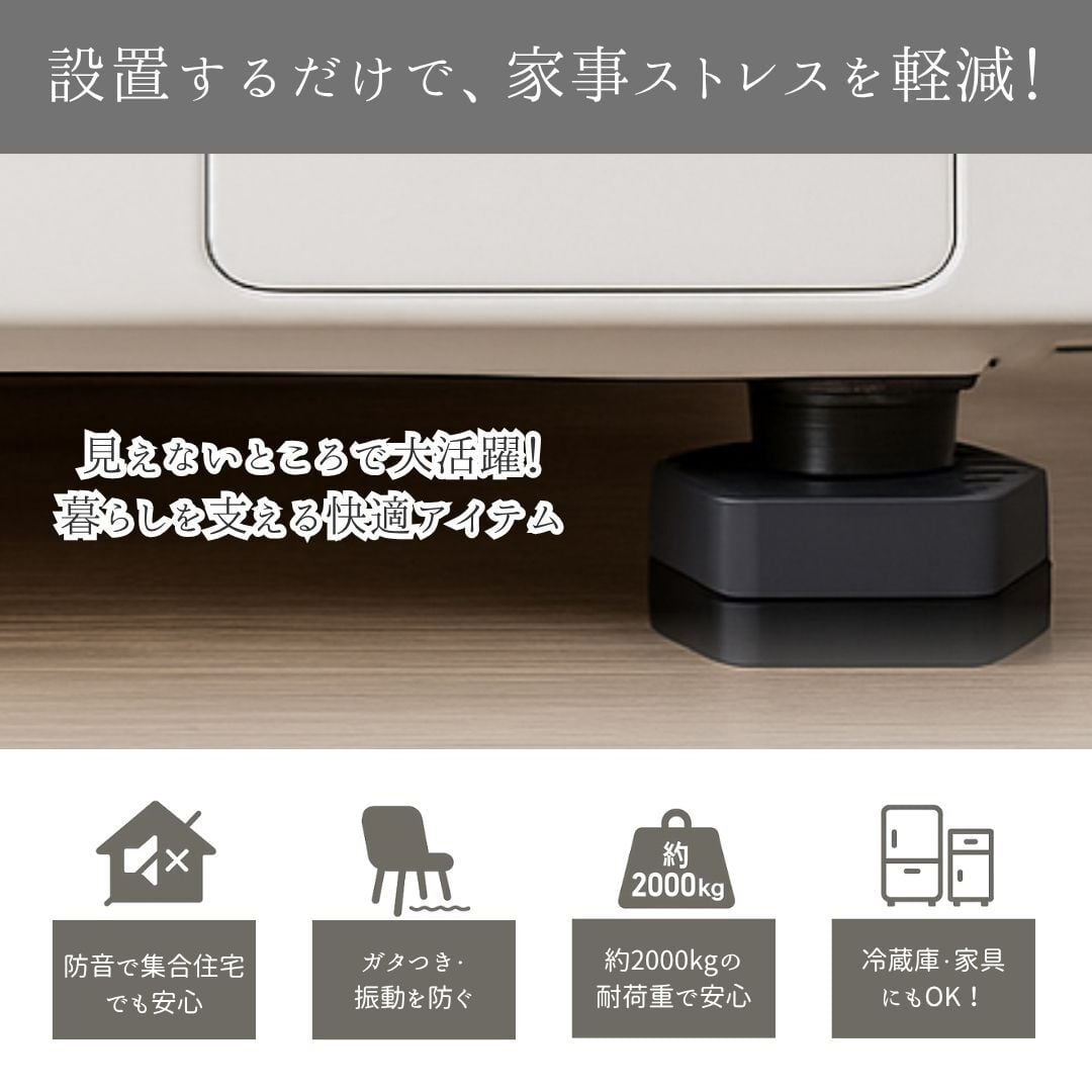 約4cmの高さで洗濯機下にスペースを確保でき、排水ホースの通りや掃除の利便性がアップ。滑り止め効果とゴムの弾性によって、動作中の振動によるズレや床への衝撃をしっかり吸収します。