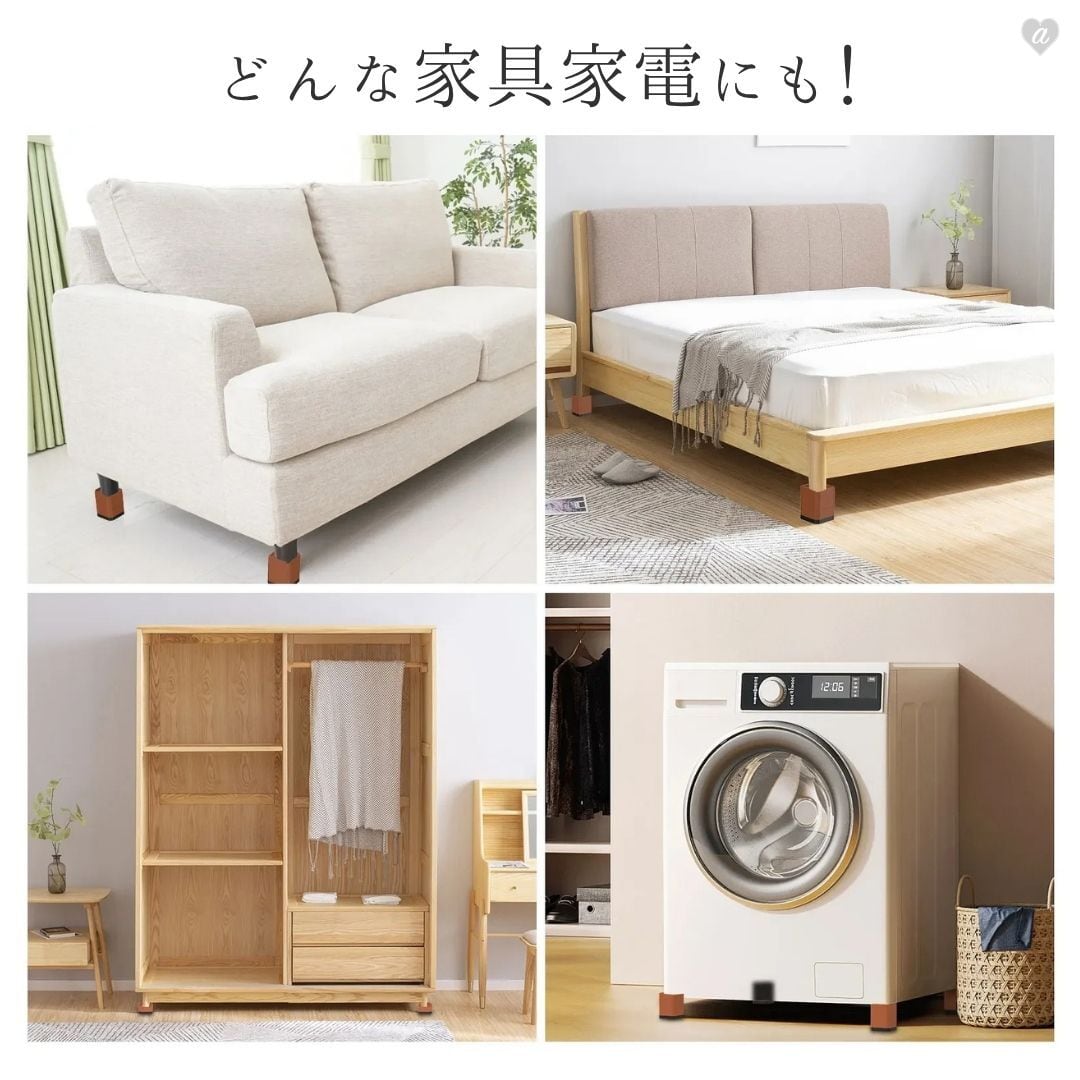 洗濯機だけでなく、冷蔵庫や乾燥機、ベッド、食器棚など、脚付き家具全般に対応。見た目はシンプルながら、日々の暮らしを快適に支えてくれる頼れるアイテムです。