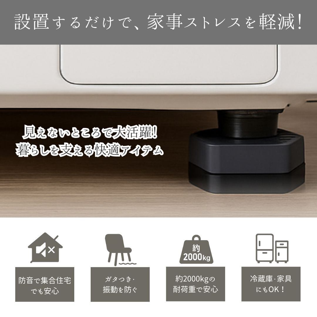 洗濯機だけでなく、冷蔵庫や乾燥機、ベッド、食器棚など、脚付き家具全般に対応。見た目はシンプルながら、日々の暮らしを快適に支えてくれる頼れるアイテムです。