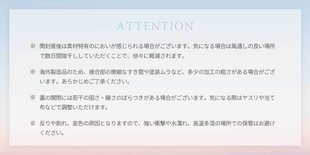 ※蓋の開閉には若干の固さ・緩さのばらつきがある場合がございます。気になる際はヤスリや当て布などで調整いただけます。