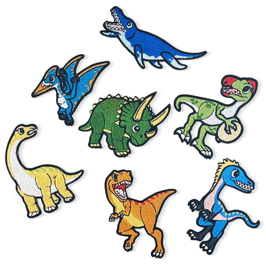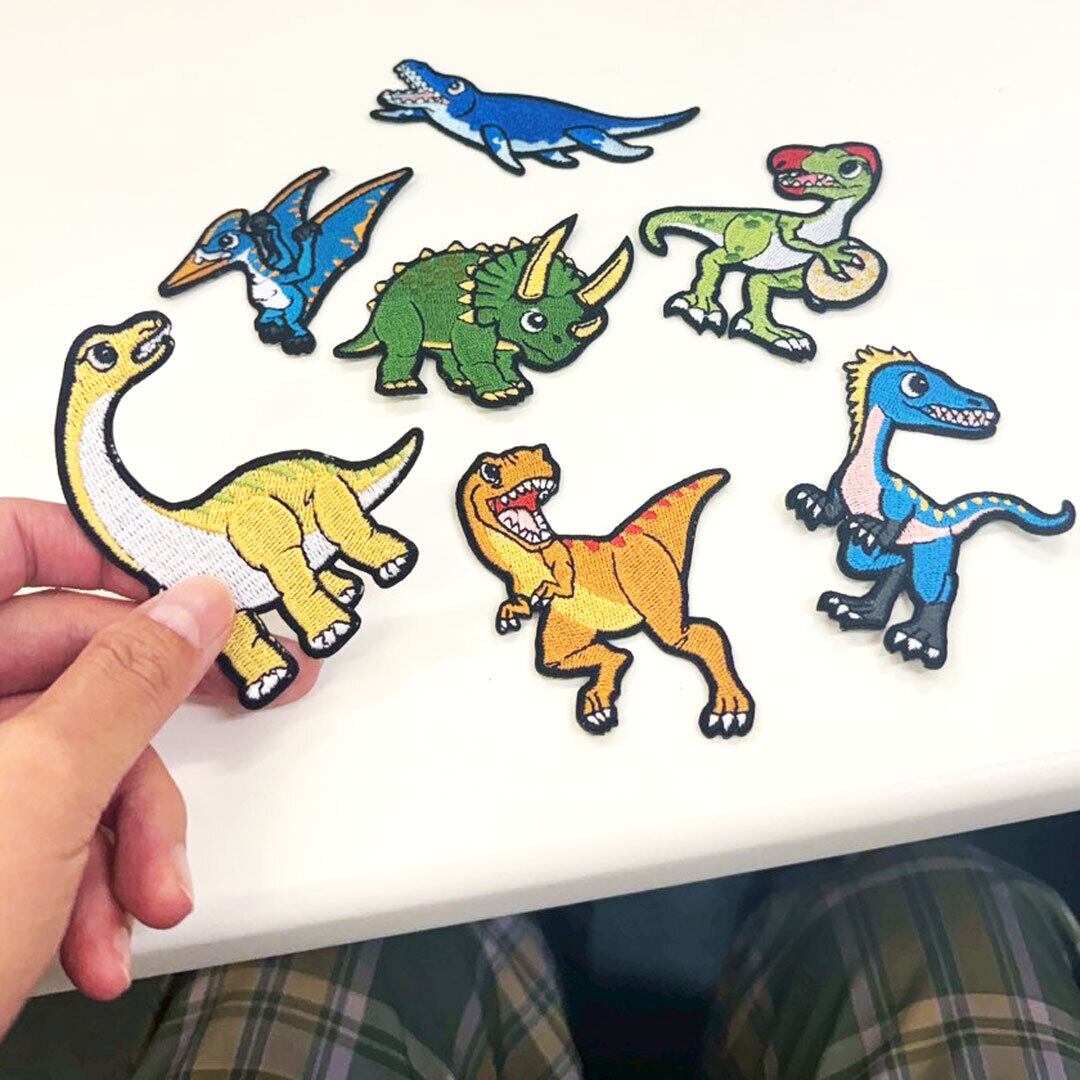 カラフルで可愛い恐竜たちがモチーフになった刺繍ワッペンです。
