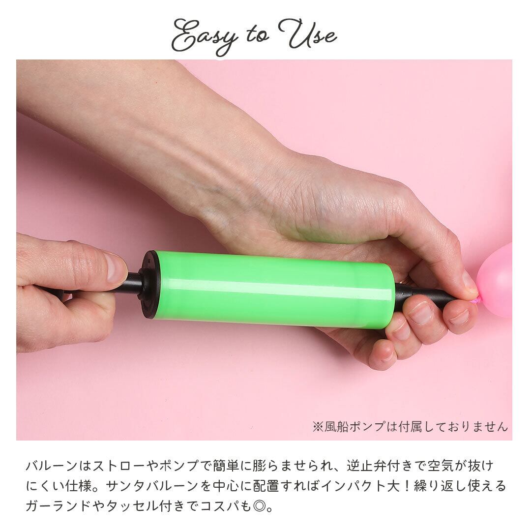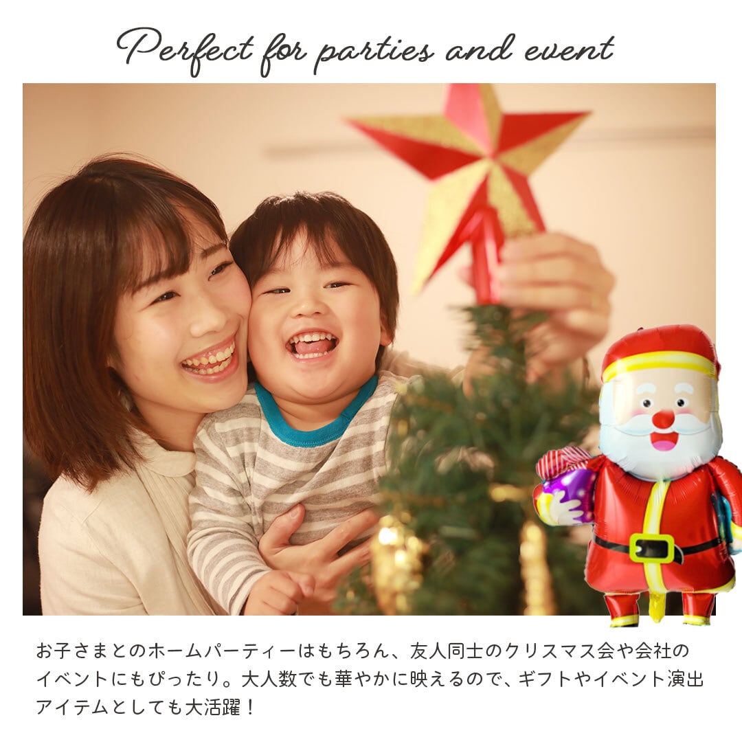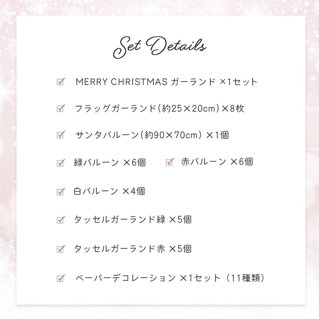 存在感たっぷりのビッグサンタバルーンを中心に、赤・白・緑のバルーンや、華やかなガーランド、フラッグ、タッセルなど、パーティーを盛り上げるアイテムをたっぷり詰め込んだ豪華セット。これでクリスマスの飾り付けはばっちり!!