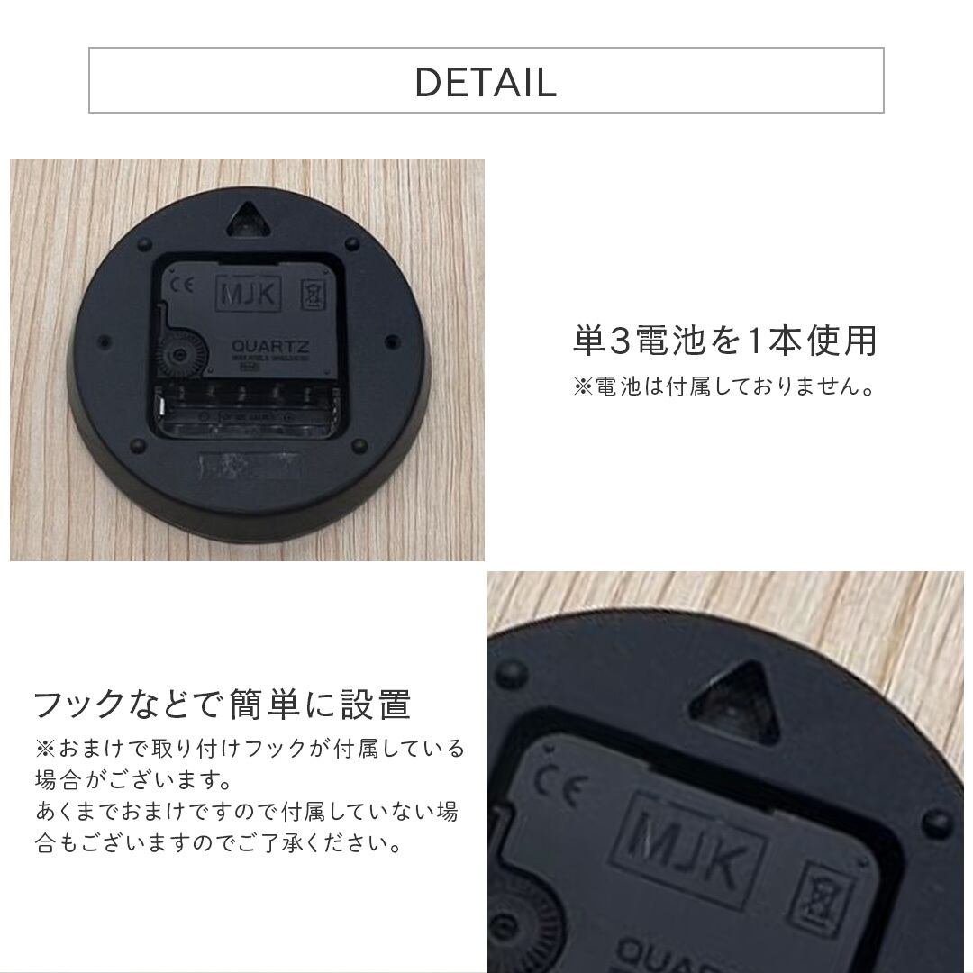 しっかりとした作りで単三電池1本で動作し、設置も簡単。背面にはフック用の穴があり、壁掛けもスムーズです。