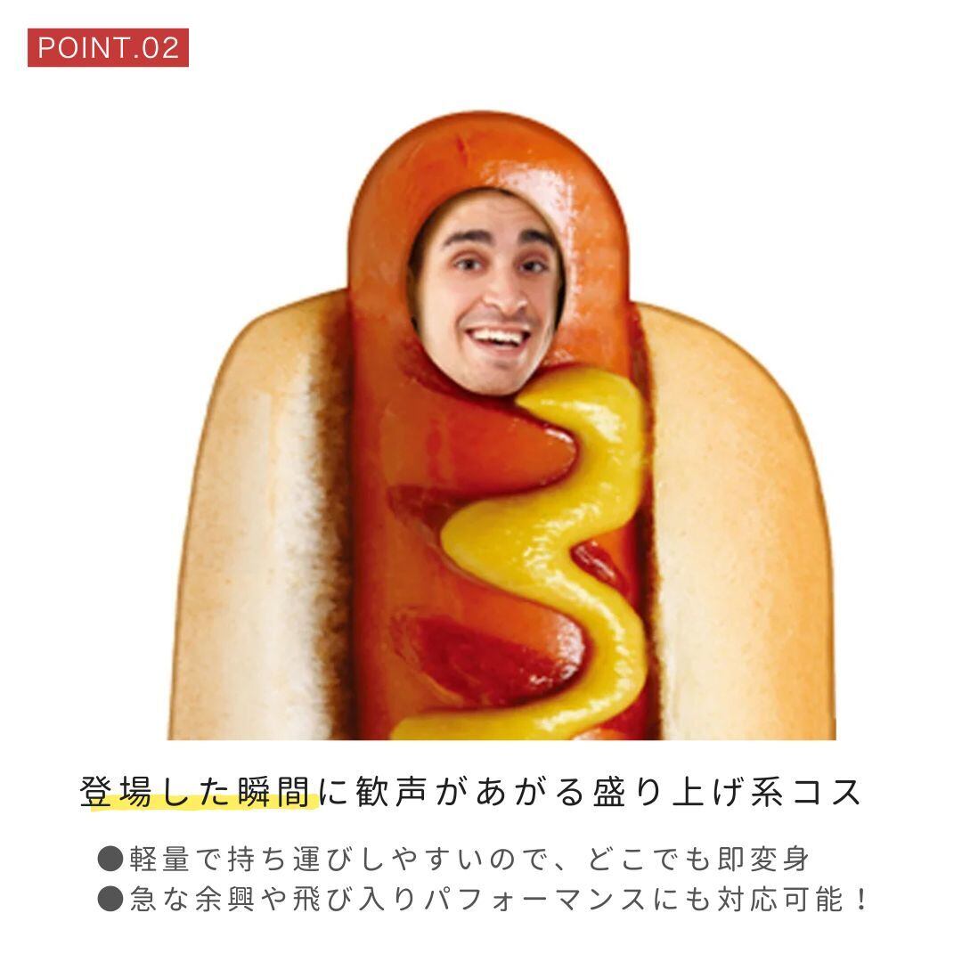 ケチャップ&マスタードがたっぷりかかったホットドッグ着ぐるみと、まるで腫れ上がったような厚みのある真っ赤な唇が目を引くたらこ唇マスクがセットに。強烈なビジュアルで、仮装イベントやパーティーで大注目間違いなし!