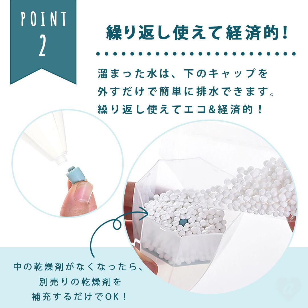 溜まった水は下部のキャップを外せば簡単に排水可能。中の乾燥剤がなくなったら、新しい乾燥剤(※別売り)を補充するだけでOK。