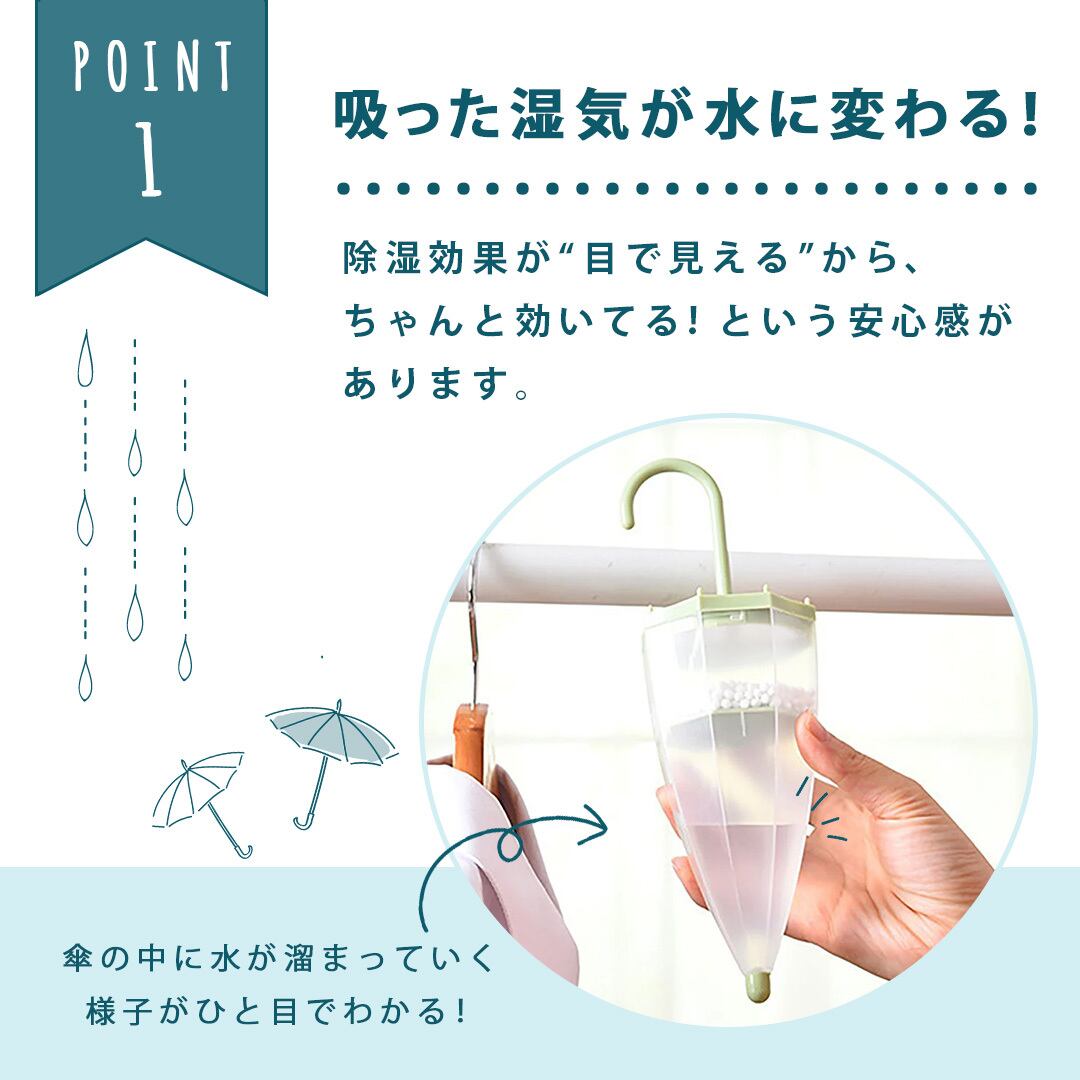 除湿剤として入っているのは、白い小さな粒状の乾燥剤。空気中の湿気をしっかりキャッチして水に変わります。除湿効果が目に見えて分かるので、「ちゃんと効いてる!」という安心感があります。傘の下部に水が溜まっていく様子が見えるのもユニーク。