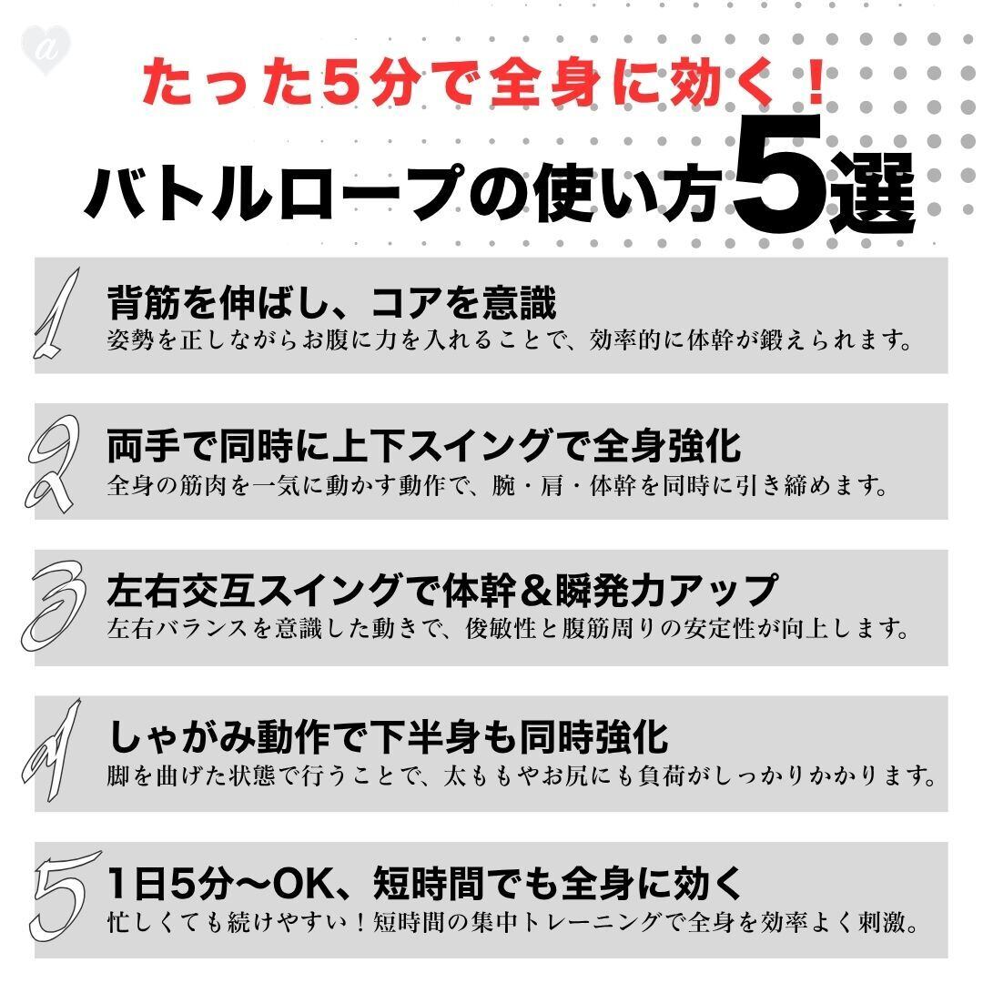 ロープの端を持ち上下に振ることで、全身の筋力・体幹・バランス・心肺機能までしっかり鍛えられます。振り方次第で鍛えられる部位が変わるため、目的に応じたトレーニングが可能。