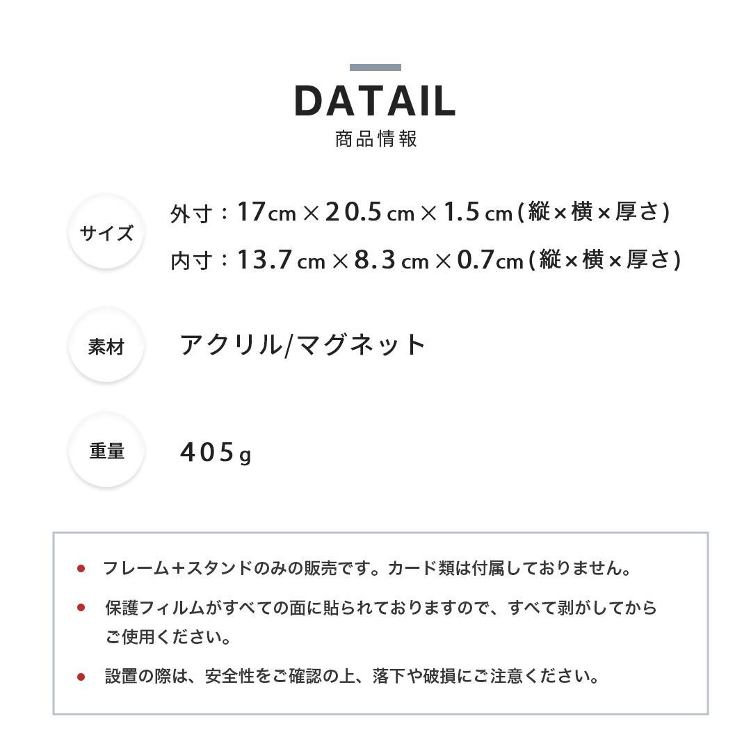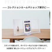 透明度の高いアクリル素材を使用し、カード本来の美しさや鑑定ラベルの存在感を損なうことなく展示可能。フロントカバーはマグネット式で、工具不要で簡単に開閉できるため、カードの入れ替えもスムーズです。