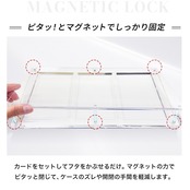 透明度の高いアクリル素材を使用し、カード本来の美しさや鑑定ラベルの存在感を損なうことなく展示可能。フロントカバーはマグネット式で、工具不要で簡単に開閉できるため、カードの入れ替えもスムーズです。