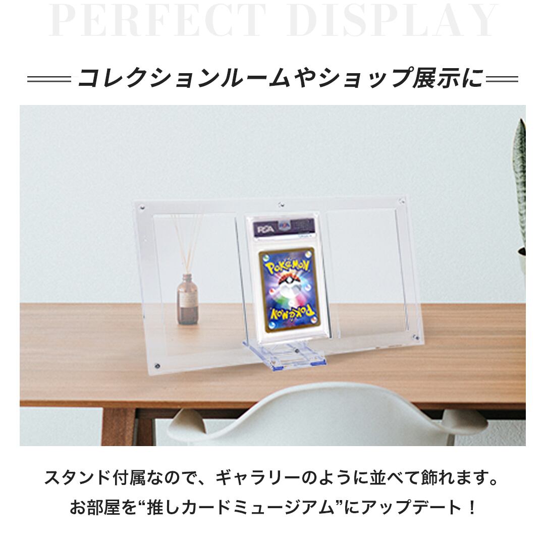 ポケモンカードや遊戯王、スポーツカードなどのPSA鑑定済みカードをワンランク上のスタイルで美しく魅せる、マグネット開閉式のアクリルディスプレイと専用スタンドがセットになった、観賞用に特化したプレミアムディスプレイスタンドです。