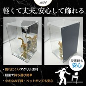 本製品は光透過の高品質アクリルを使用。ガラスのような透明感を持ちながら、軽量で割れにくい特性を備えています。ケース越しでも中のフィギュアが鮮やかに見え、ケースの存在を感じさせない自然な観賞体験を実現します。にごりの少ないクリアな仕上がりです。