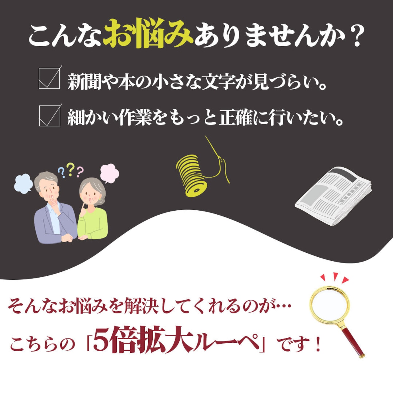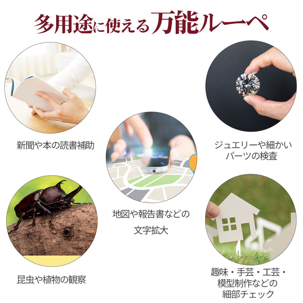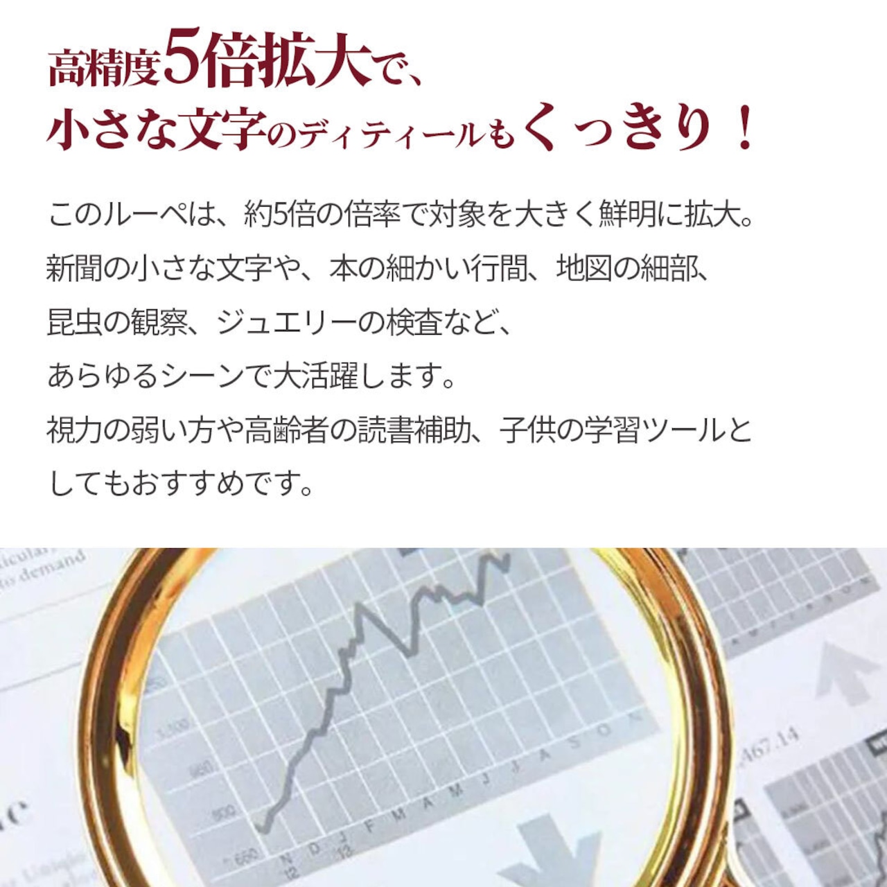 このルーペは、約5倍の倍率で対象を大きく鮮明に拡大。新聞の小さな文字や、本の細かい行間、地図の細部、昆虫の観察、ジュエリーの検査など、あらゆるシーンで大活躍します。視力の弱い方や高齢者の読書補助、子どもの学習ツールとしてもおすすめです。