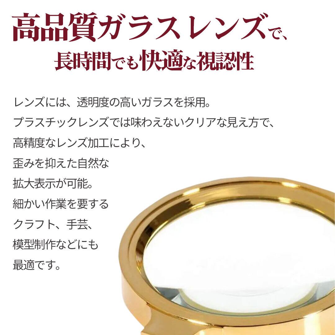 レンズには、透明度の高いガラスを採用。プラスチックレンズでは味わえないクリアな見え方で、高精度なレンズ加工により、歪みを抑えた自然な拡大表示が可能。細かい作業を要するクラフト・手芸・模型製作などにも最適です。