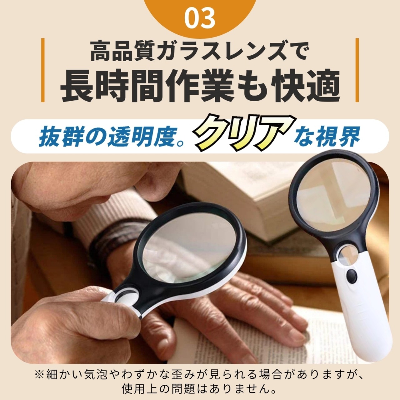 レンズには、透明度の高いガラスを採用。プラスチックレンズでは味わえないクリアな見え方で、高精度なレンズ加工により、歪みを抑えた自然な拡大表示が可能。細かい作業を要するクラフト・手芸・模型製作などにも最適です。