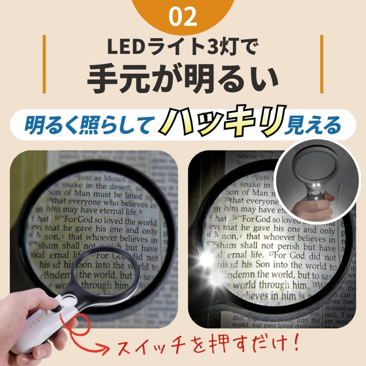 拡大鏡 ルーペ LED付き 虫眼鏡 全2色 手持ちルーペ 約3倍拡大 約45倍拡大 手持ち 読書 リーディングルーペ 書類 作業 虫めがね シンプル スタイリッシュ モダン おしゃれ コンパクト 持ち運び 便利 携帯 新聞 雑誌 辞書 読みやすい 手芸 刺繍 ビーズ細工 トゲ抜き 電子部品 はんだ付け プラモデル製作 模型製作 学校 作業員 工房 書斎 北欧 ハンドメイド