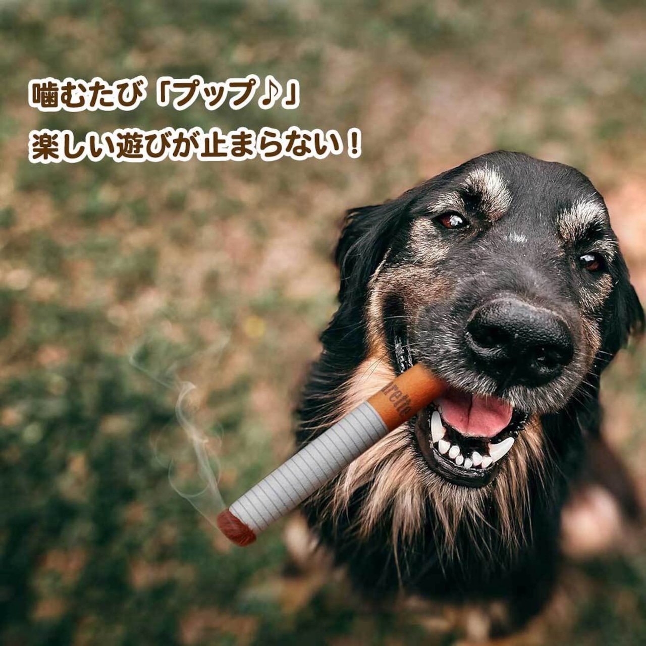 たばこ型おもちゃにはソフトスクイーキー入り。噛むたび「プップ♪」と鳴って愛犬の興味を引きつけます。噛む→鳴る→さらに噛む!楽しい遊びが止まらない♪