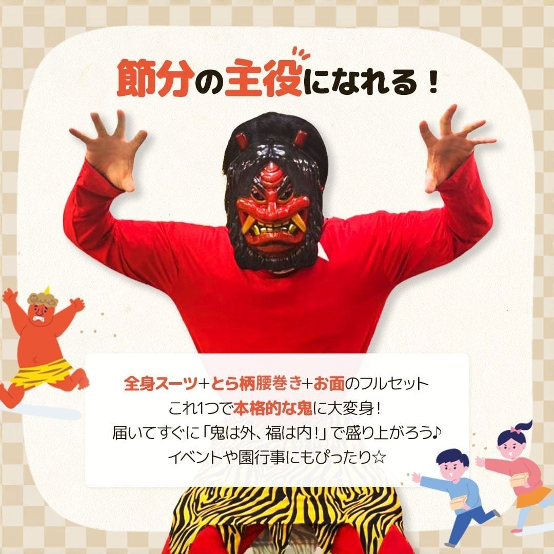 これひとつで簡単に本格的な鬼に変身できるため、保育園や幼稚園、学校、地域イベントなど、あらゆる節分行事に大活躍。