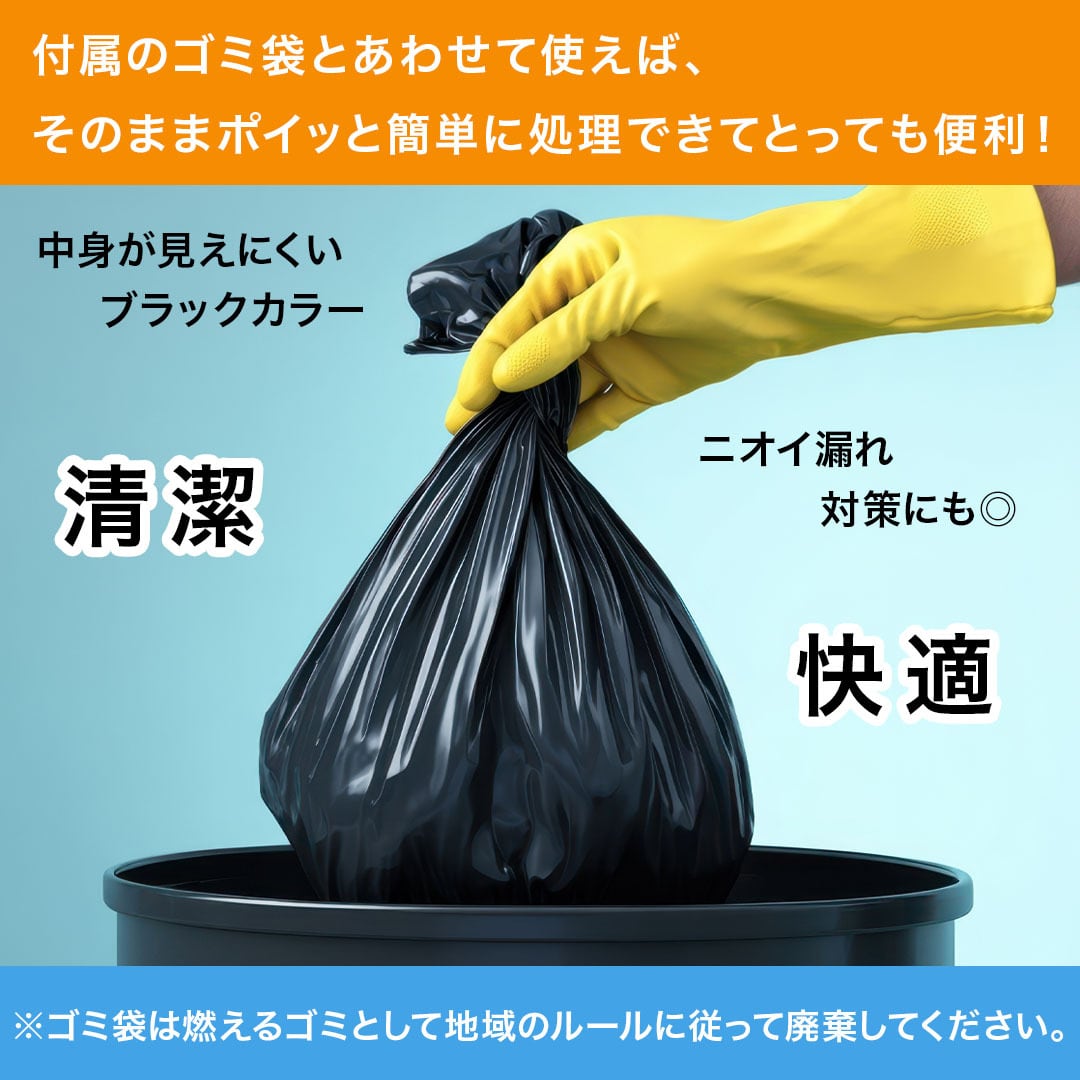 付属のゴミ袋(1ロール/30枚入り)とあわせて使えば、そのままポイッと簡単に処理できてとっても便利!中身が見えにくいブラックカラーで、ニオイ漏れ対策にも◎