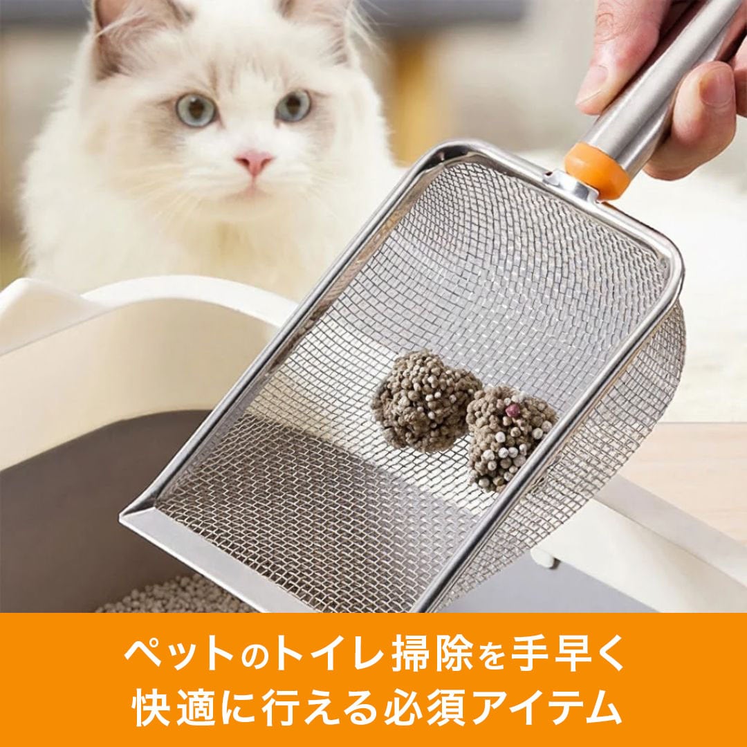 シャベルはサビに強いステンレス製。細かいメッシュ構造で余分な砂だけをスムーズに落とし、効率よくお掃除できます。軽量で扱いやすく、底が平らな形状なので砂をしっかりすくい上げられ、トイレ掃除の時短にも効果的。フックホール付きで、使用後はフックに掛けてスッキリ収納。置き場所にも困らず、衛生的に保管できます。