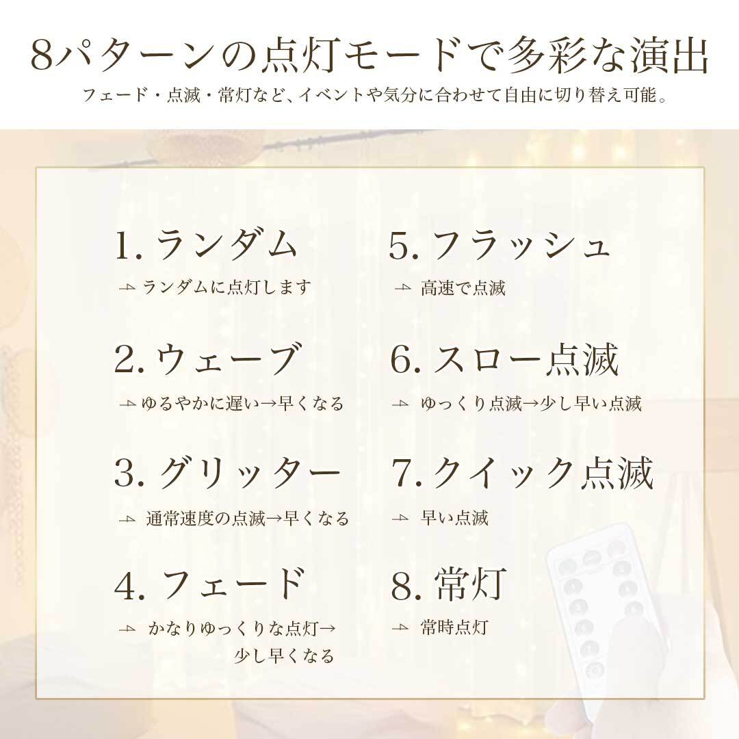 LEDライトは8種類の点灯モードを搭載。常灯、点滅、フェード、ウェーブ、コンビネーションなど、シーンに合わせた演出が可能。USB式で場所を選ばず設置できるので、リビングや寝室、玄関、ベランダ、ショップのウィンドウなど幅広いシーンで活用できます。消費電力が少なく、省エネで経済的なのも嬉しいポイント♪