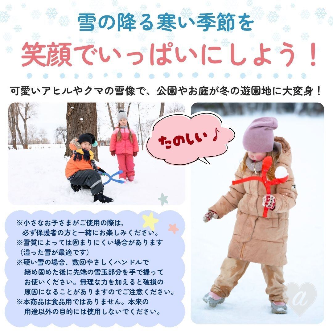 雪をはさんでギュッと閉じるだけであっという間に可愛い雪像が作れちゃう!ふんわりとした雪でもしっかり固まり、手を濡らさずスピーディーに量産可能。片手で握れるコンパクトなサイズ感は、小さな手でも持ちやすく、初めての雪あそびデビューにも最適です!