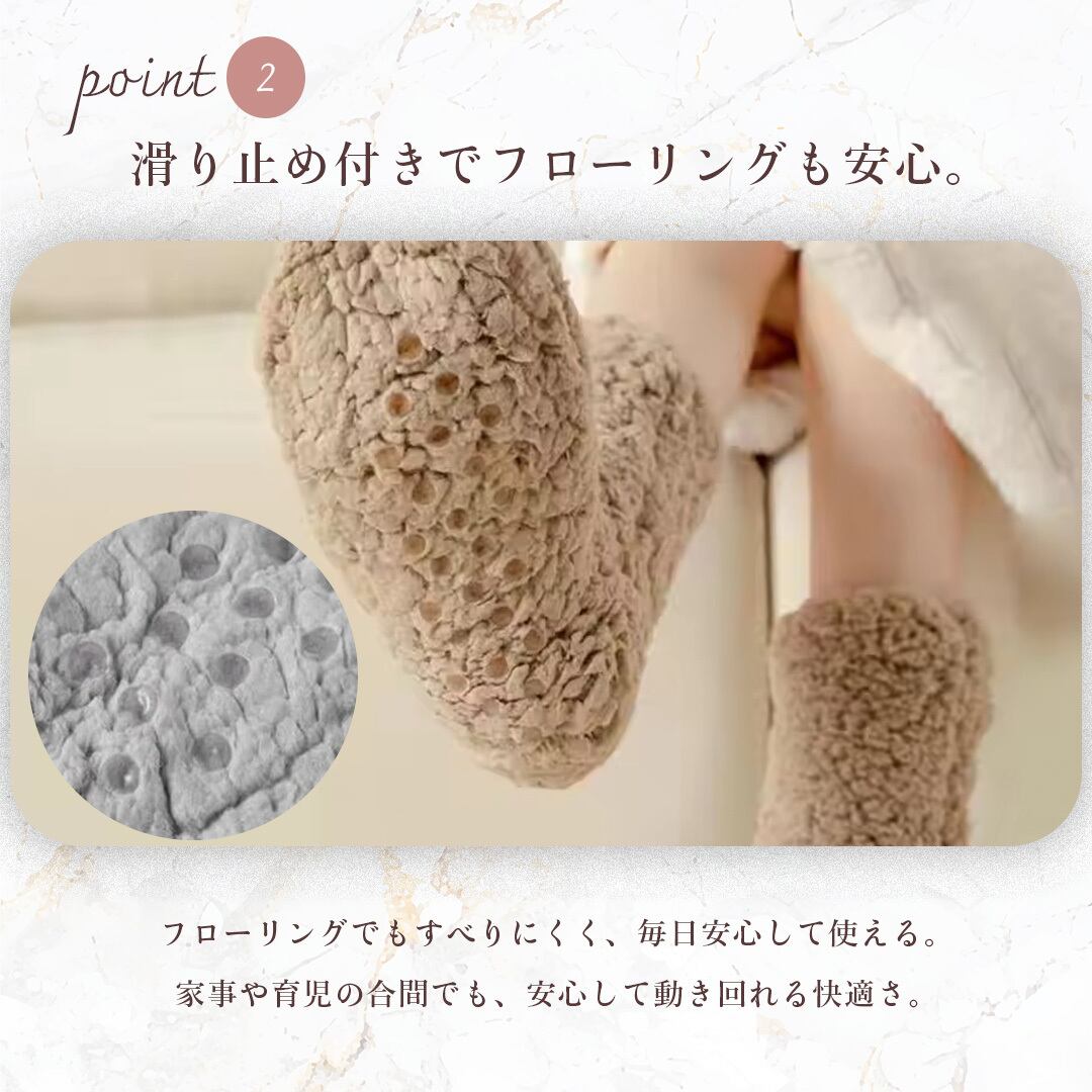 内側も外側もふわふわ素材で、履いた瞬間から足先までしっかりぽかぽか。まるで毛布に包まれているような柔らかな暖かさが、一日中続きます。