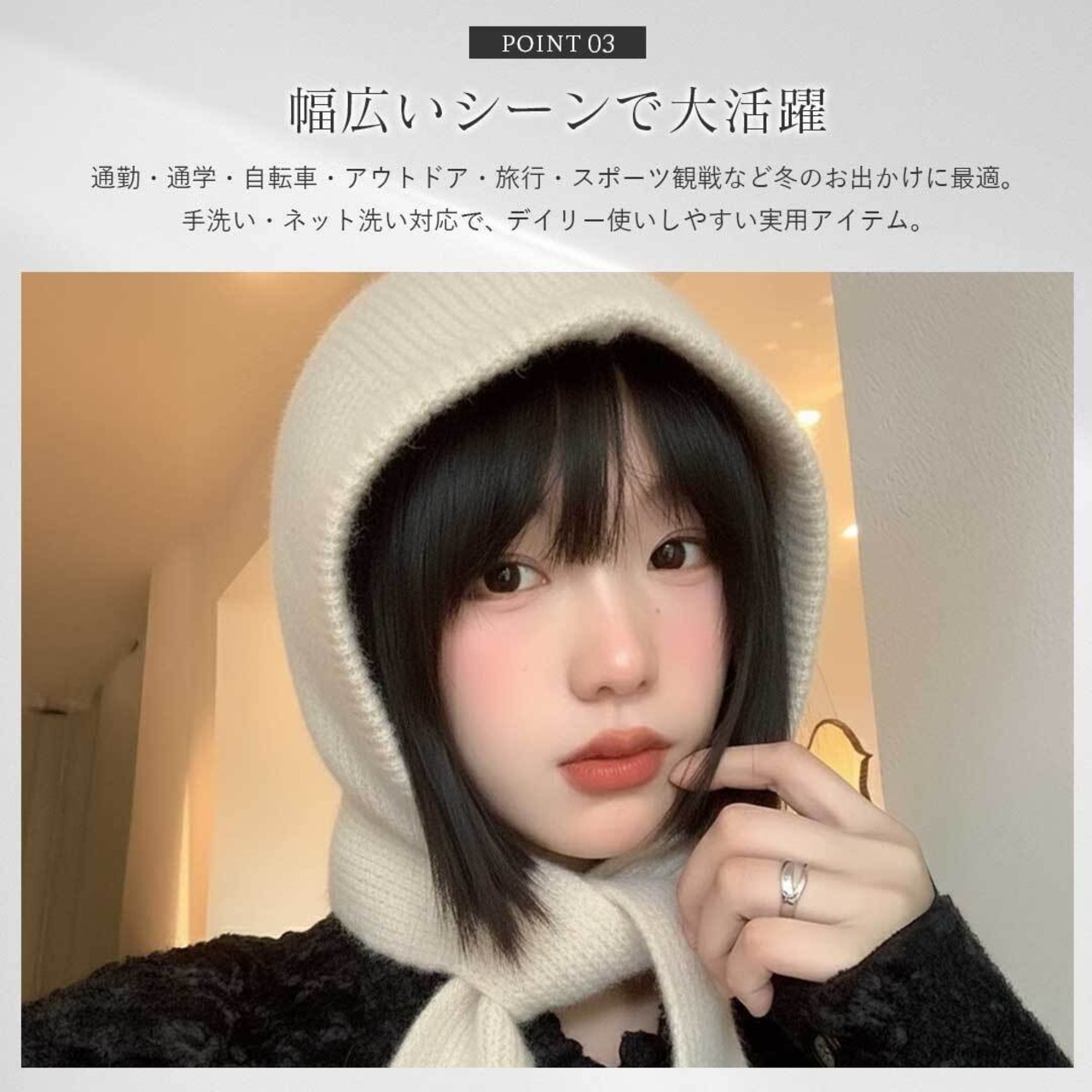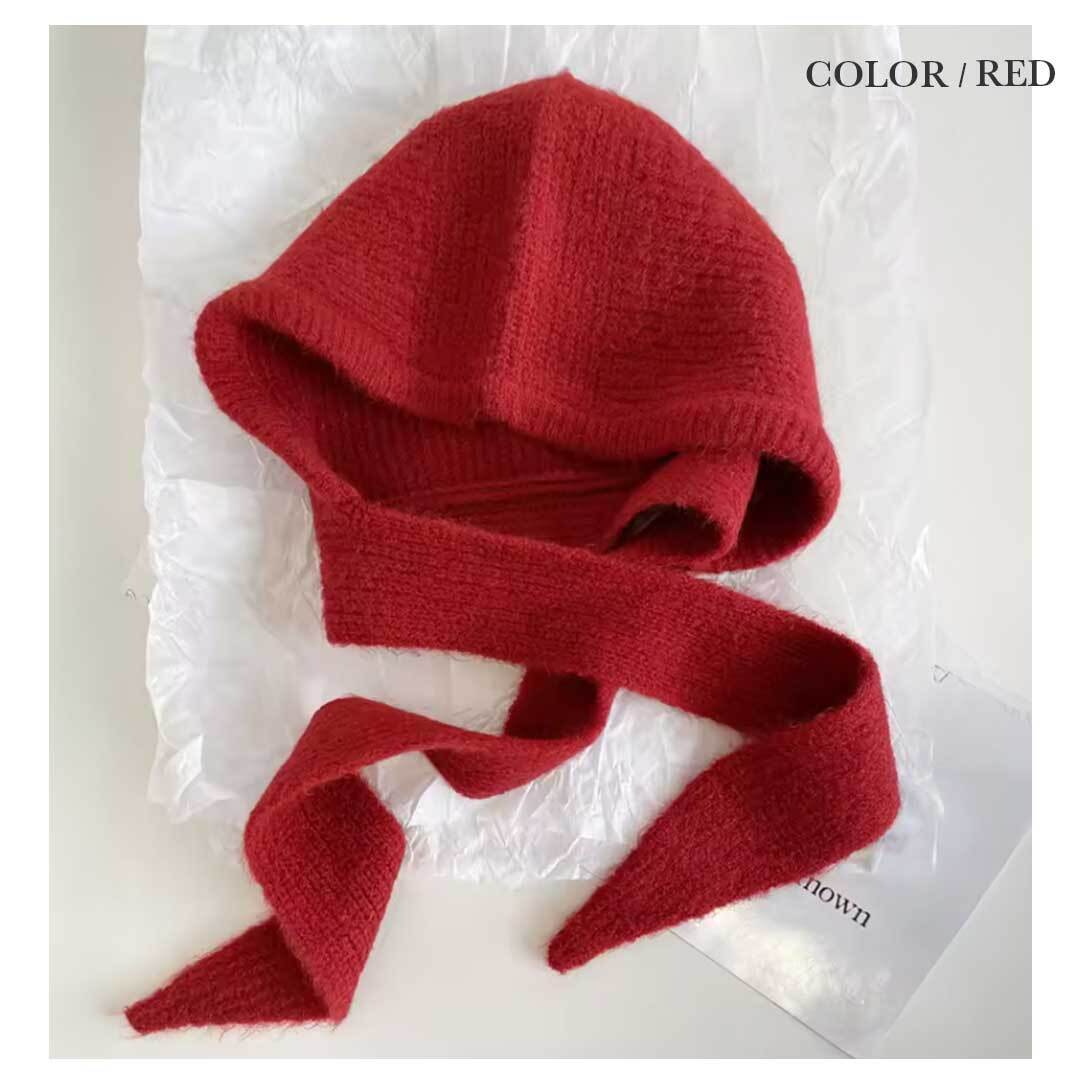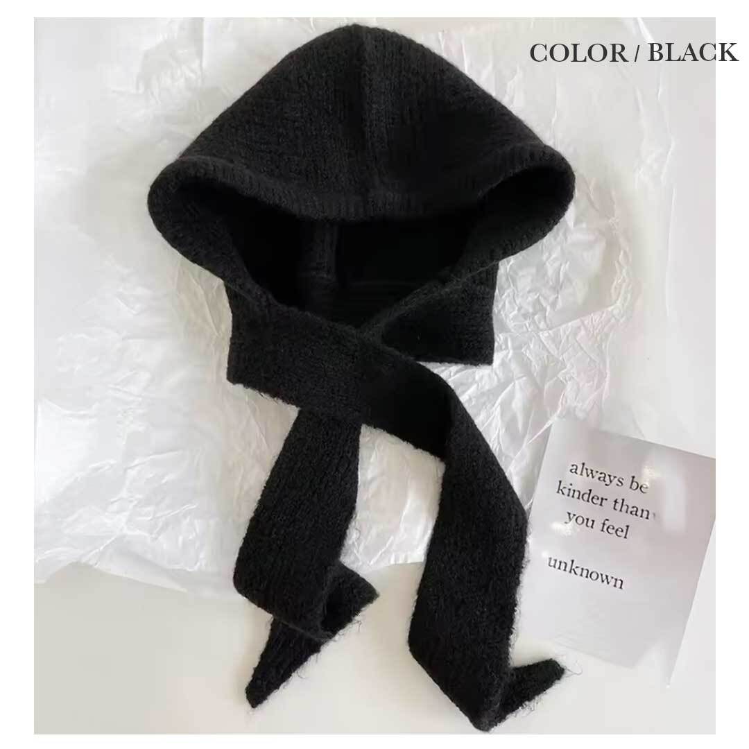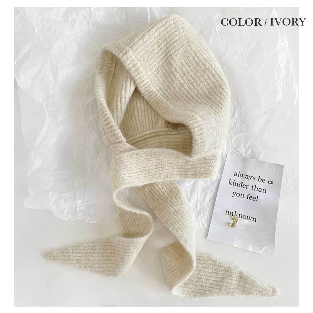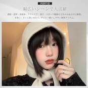 ふんわり柔らかいニット素材は肌ざわりが良く、軽いのにしっかり暖かいのが特徴。頭・耳・首までを一度にカバーするため、冷風を通しにくく、マフラーがずれてしまう心配もありません。フード部分は程よい厚みで形が崩れにくく、かわいらしいシルエットが楽しめます。