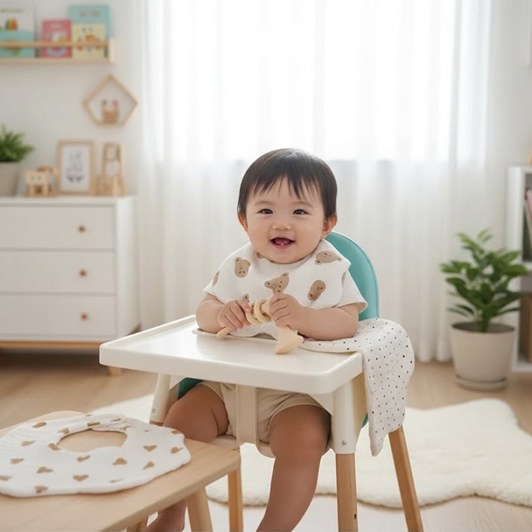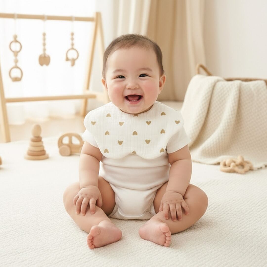 こちらのスタイは、吸水性と通気性に優れた 6層コットンガーゼ を採用。ふんわりとした柔らかさで赤ちゃんの首まわりをやさしく包み込みます。