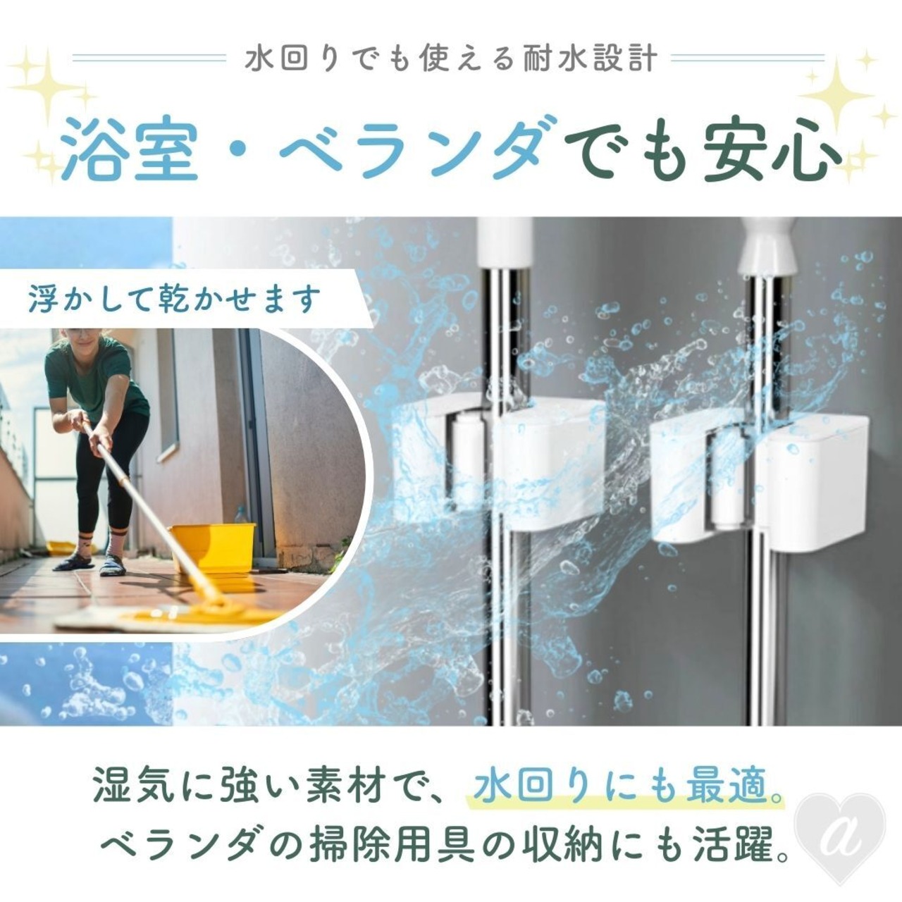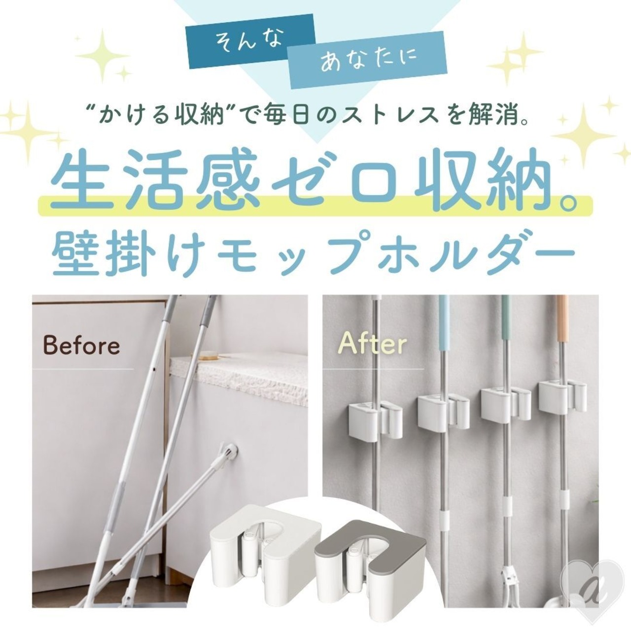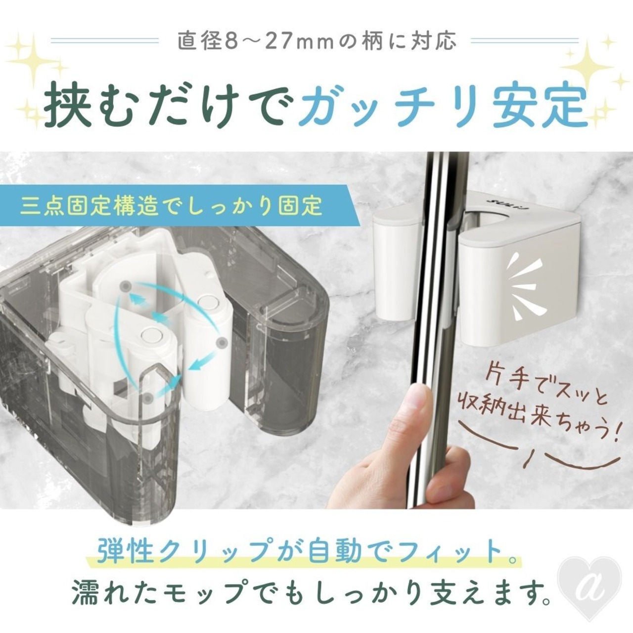 モップやほうき、ブラシなどを挟むだけで固定でき、使いたいときにさっと取り外せるのが特長です。