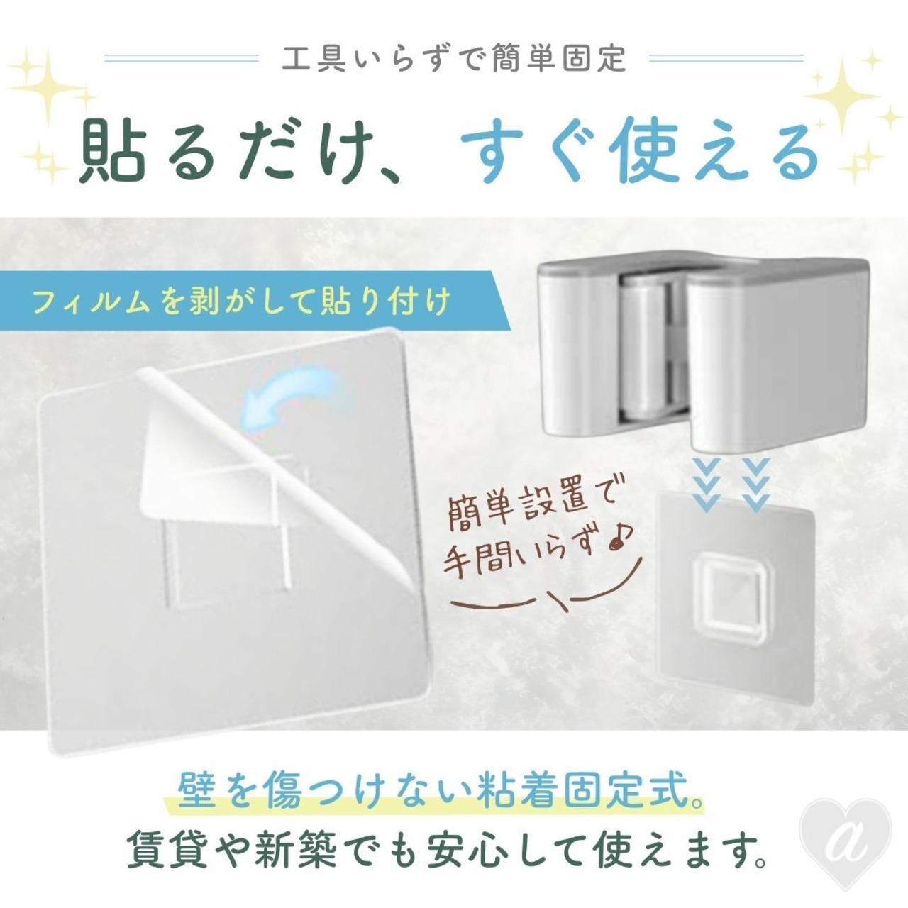 穴あけ不要の粘着タイプなので、工具を使わず簡単に設置できます。
