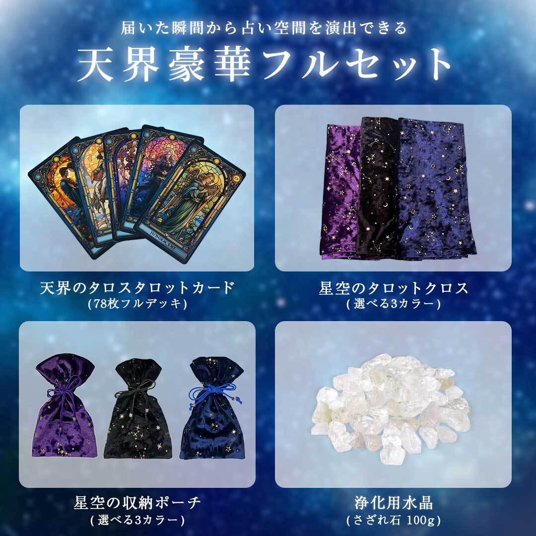 【特典|運命の1枚】 タロット 天界のタロット4点セット 【天界のタロス+星空のテーブルクロス&ポーチ+パワーストーン 水晶 さざれ石】 選べるクロス3カラー タロットカード テーブルクロス ポーチ パワーストーン セット クラシック カード オラクルカード オラクル oracle | AiO ONLINE STORE