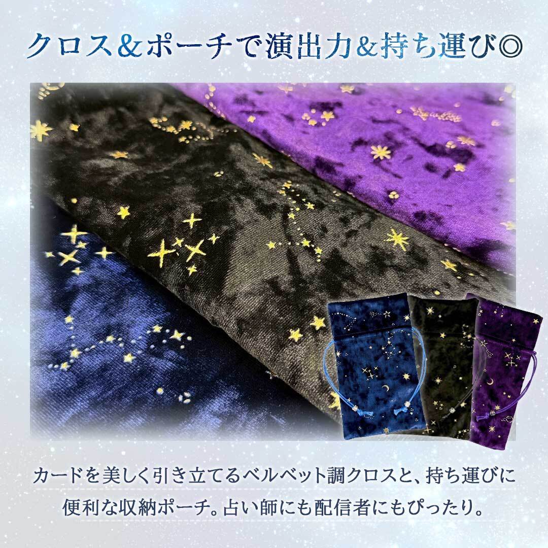 ☆ スピリチュアルな世界観が好きな方にも満足いただけるデザイン。幻想的な星空クロスで演出力が高まり、リーディングの時間が特別なひとときに