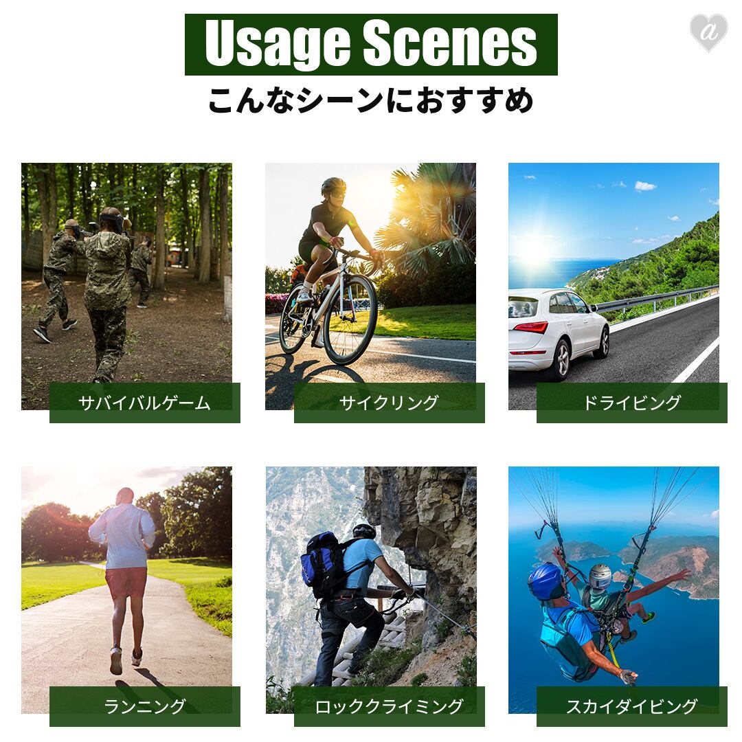 【対応シーン】 バイク/自転車/サバゲー/登山/ロッククライミング/スカイダイビング/ドライブ/アウトドア/釣り/雪山・スキー など