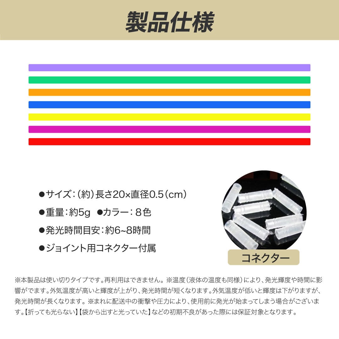 8色のカラースティック入りで、お祭り・縁日・キャンプ・花火大会・コンサート・パーティーなど、あらゆるシーンで大活躍!付属のコネクターを使えば、ブレスレット・ネックレス・輪投げ・装飾アイテムとしても自由にアレンジOK。