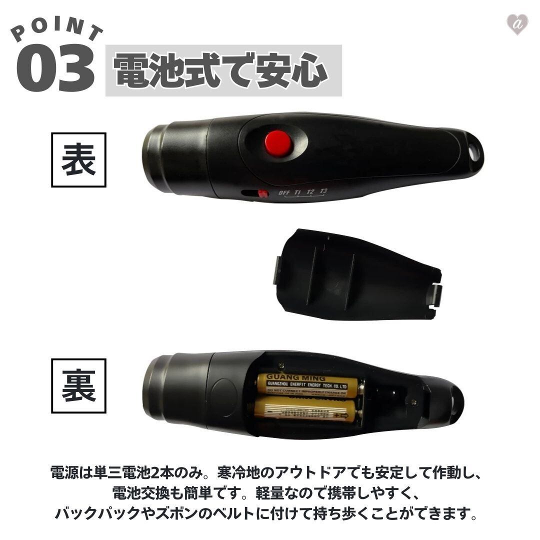 電源は単三電池2本のみ。寒冷地のアウトドアでも安定して作動し、電池交換も簡単です。軽量なので携帯しやすく、バックパックやズボンのベルトに付けて持ち歩くことができます。