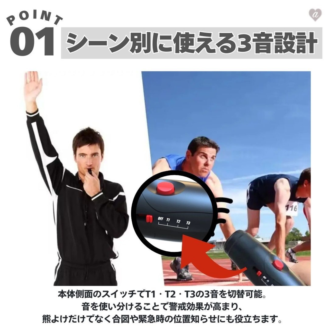 本体側面のスイッチで音色をT1 T2 T3の3種類から選べます。繰り返し同じ音を聞かせるよりも複数の音を使い分けることで、より効果的に警戒を促すことができます。動物への威嚇だけでなく、同行者との合図や緊急時の自己位置知らせにも便利です。