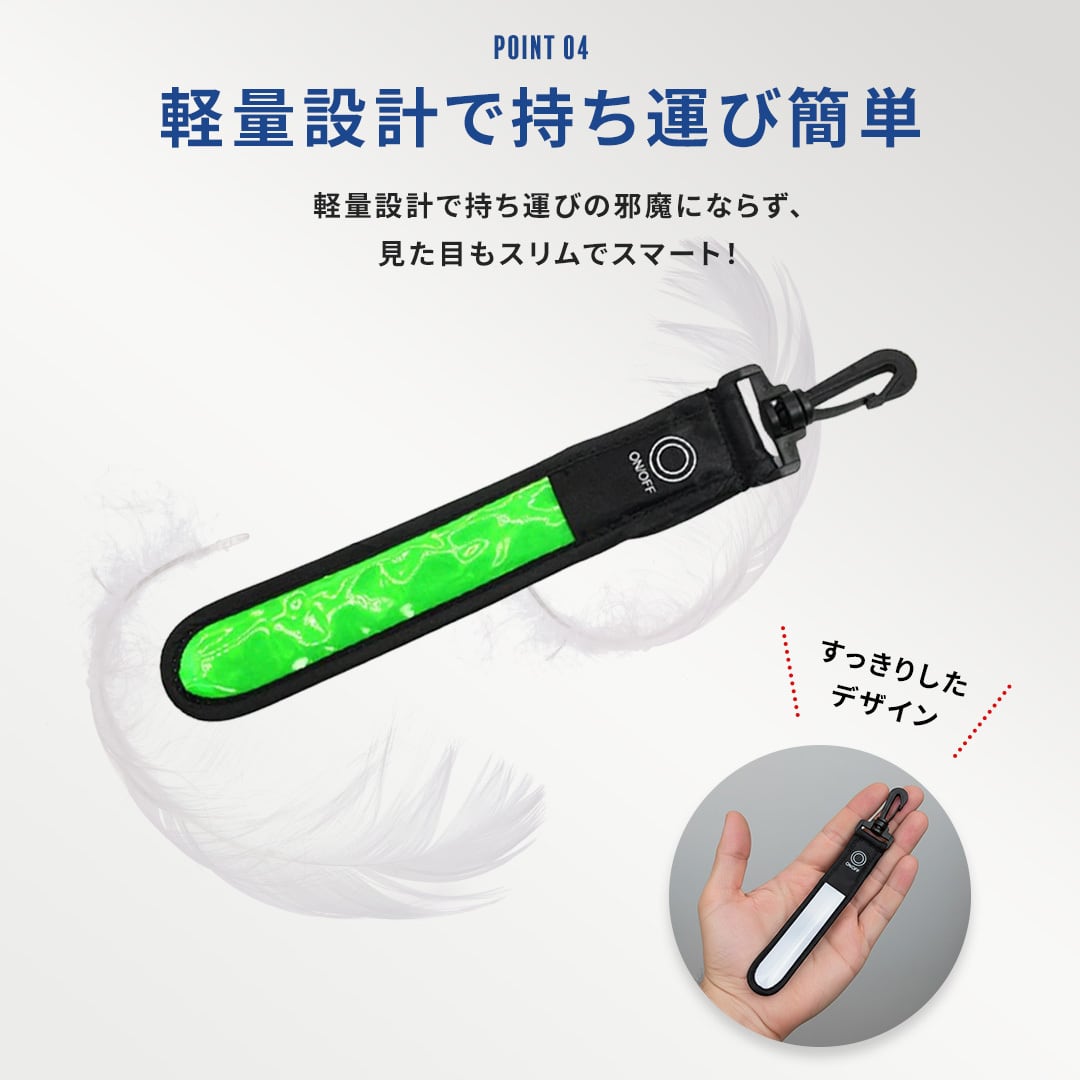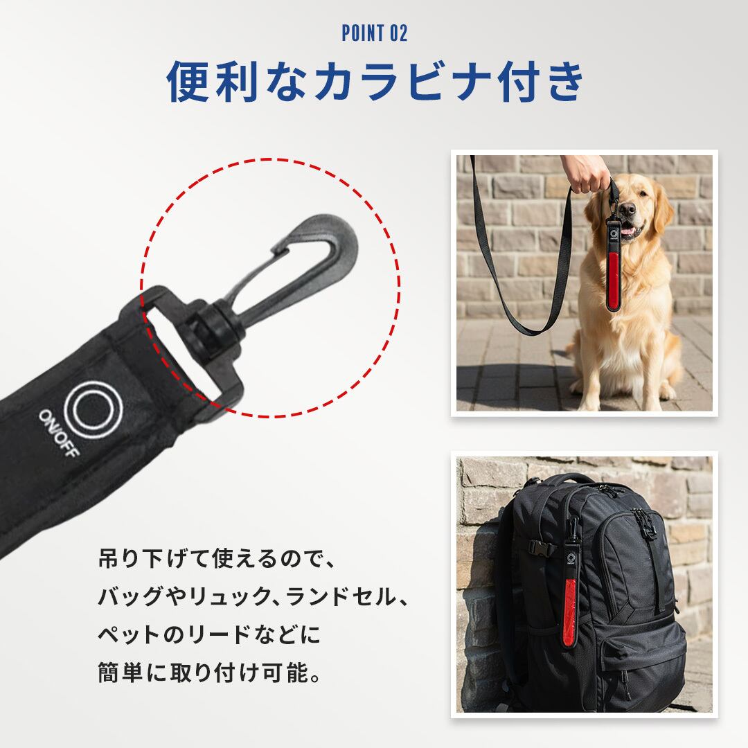 取り付け部分にはカラビナ型フックを採用しているため、ワンタッチで着脱が可能。バッグはもちろん、ベルトループやペット用リード、アウトドア用品など、さまざまな場所に取り付けてお使いいただけます。軽量設計で持ち運びの邪魔にならず、見た目もスリムでスマート。通勤・通学の毎日に、アウトドアのお供に、夜間ウォーキングやランニングの安全対策に幅広くご活用いただけます。