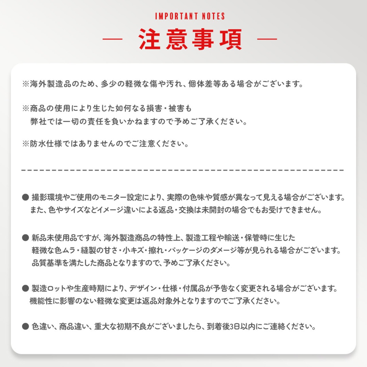 ● 新品未使用品ですが、海外製造商品の特性上、製造工程や輸送・保管時に生じた軽微な色ムラ・縫製の甘さ・小キズ・擦れ・パッケージのダメージ等が見られる場合がございます。品質基準を満たした商品となりますので、予めご了承ください。