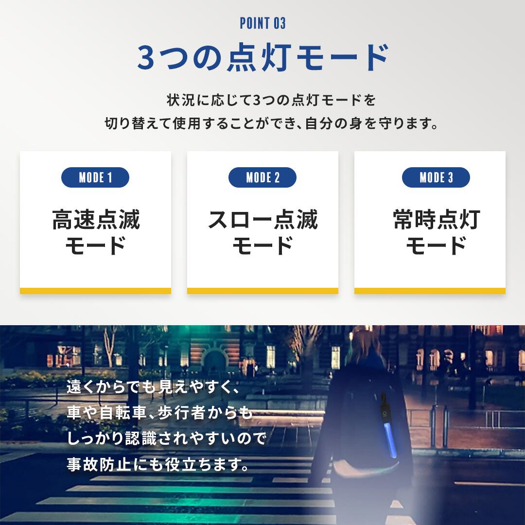 ・3つの点灯モード(高速点滅/スロー点滅/常時点灯)ON/OFFのボタンで切り替え可能