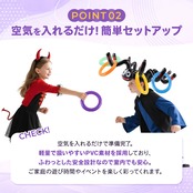 大きな目が可愛いクモをモチーフにしたエアー輪投げセットです。被るだけでもイベントの主役になれるほどインパクト抜群。クモの脚を狙って輪を投げるゲームは難易度もちょうど良く、小さなお子さまから大人まで一緒に楽しめます。ハロウィンやパーティー、室内遊びにもぴったりの映える遊び道具です。