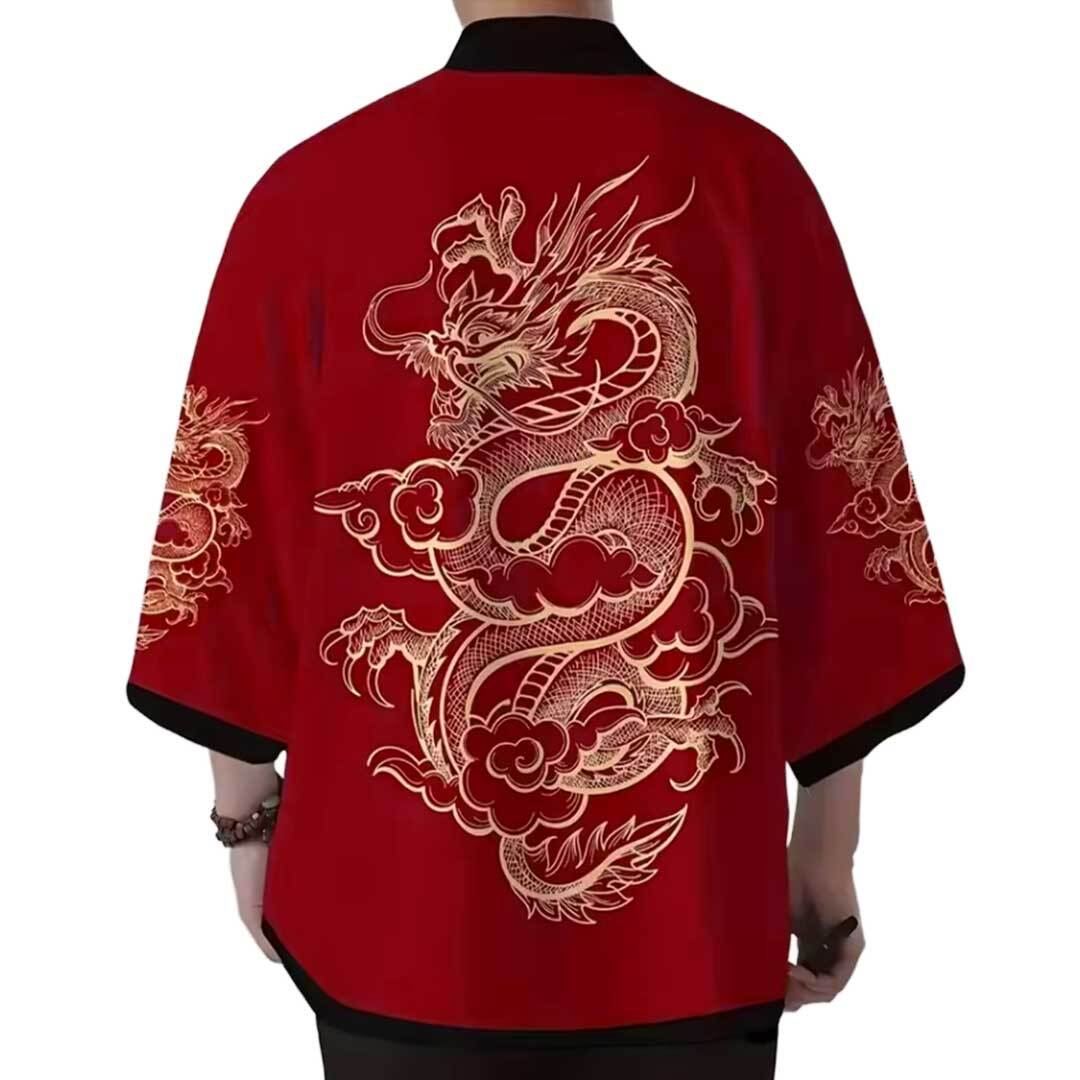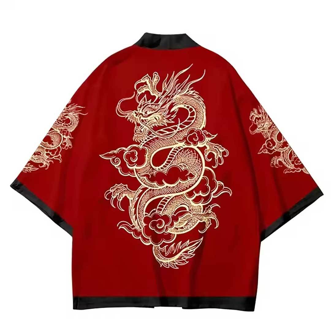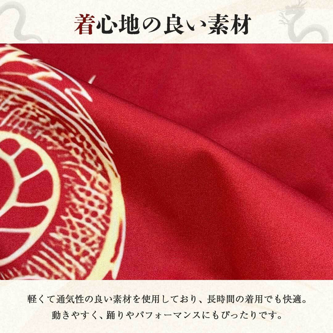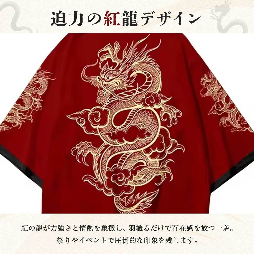 伝統的な和装スタイルに、迫力ある龍のデザインを融合させた印象的な一着。祭りやイベント、盆踊り、学園祭、ダンスや舞台演出など、さまざまな場面で華やかに映える和装スタイルの羽織です。