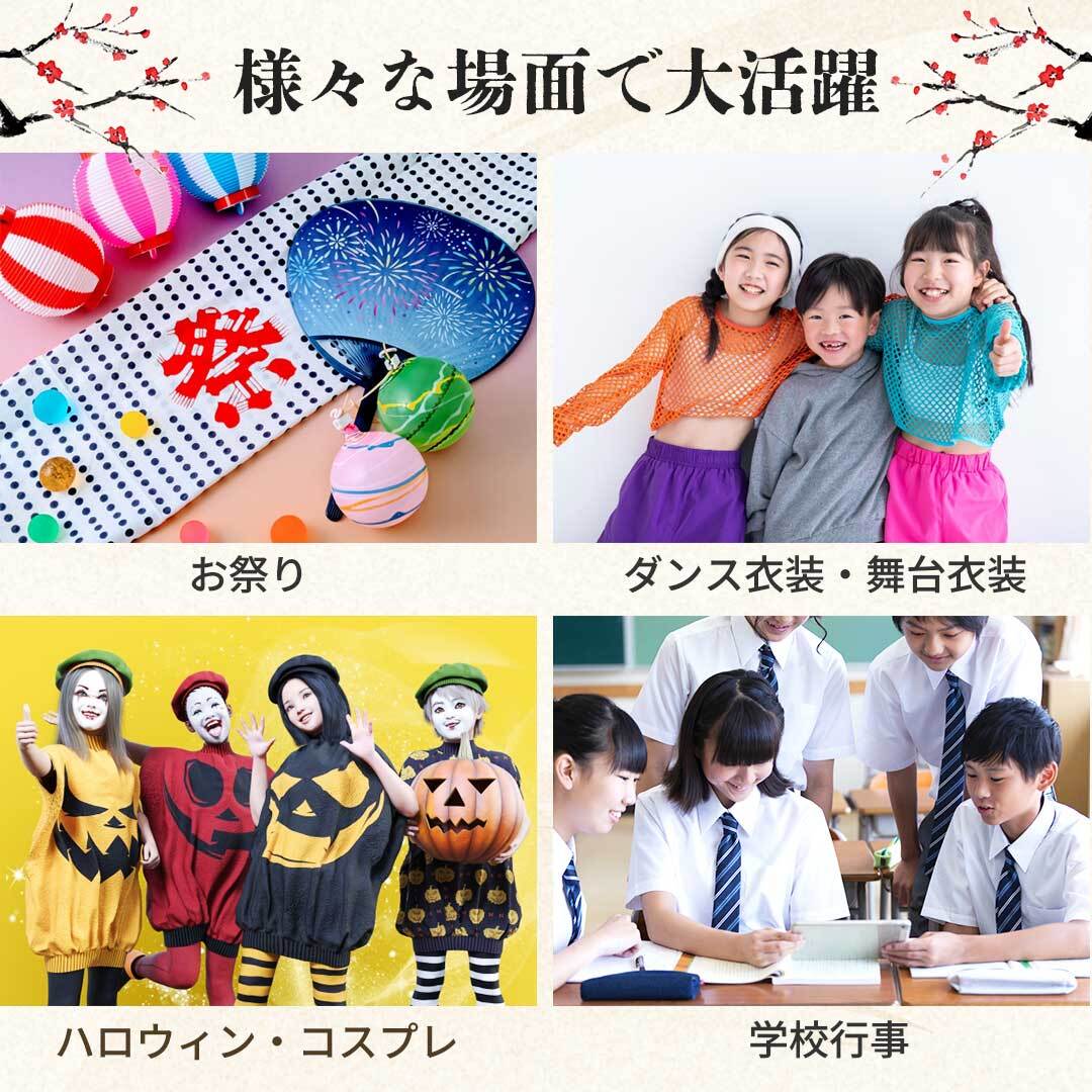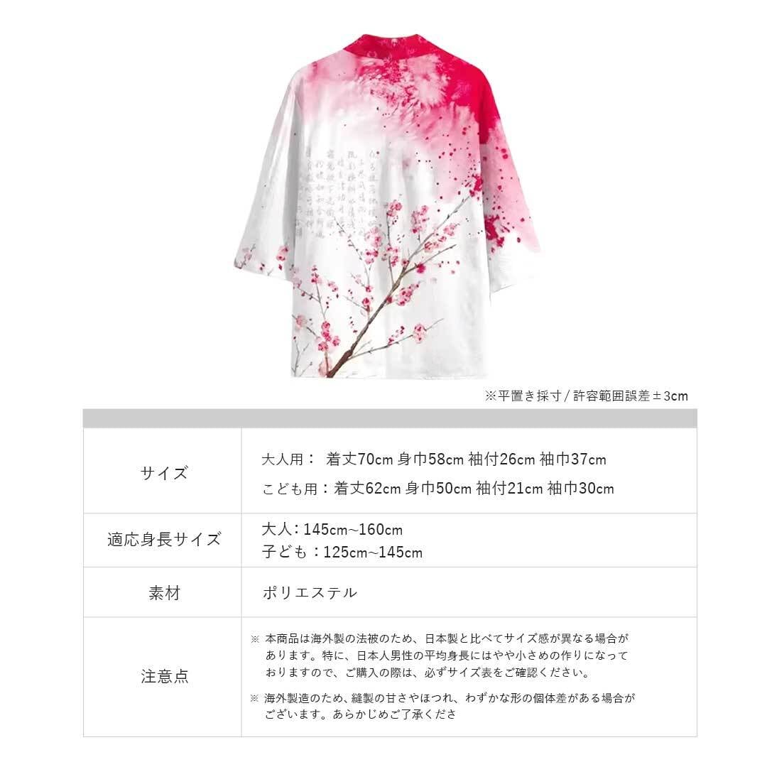 軽量で通気性の良い素材を採用しているため、長時間の着用でも快適。帯を合わせればフォーマルな印象に、羽織るだけでもカジュアルに着こなせる汎用性の高さも魅力。大人用・子供用の2サイズ展開で、家族や仲間とお揃いコーデも楽しめます。