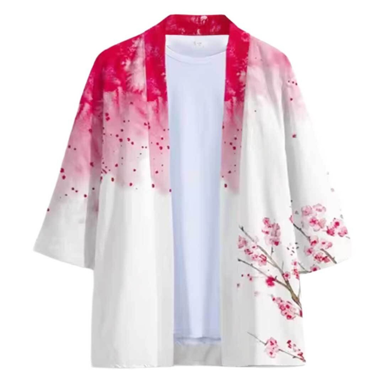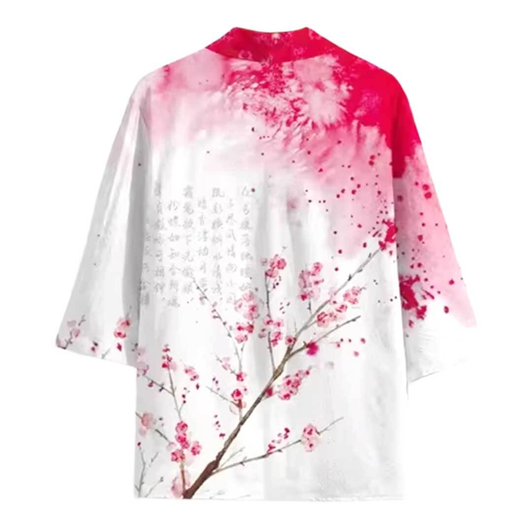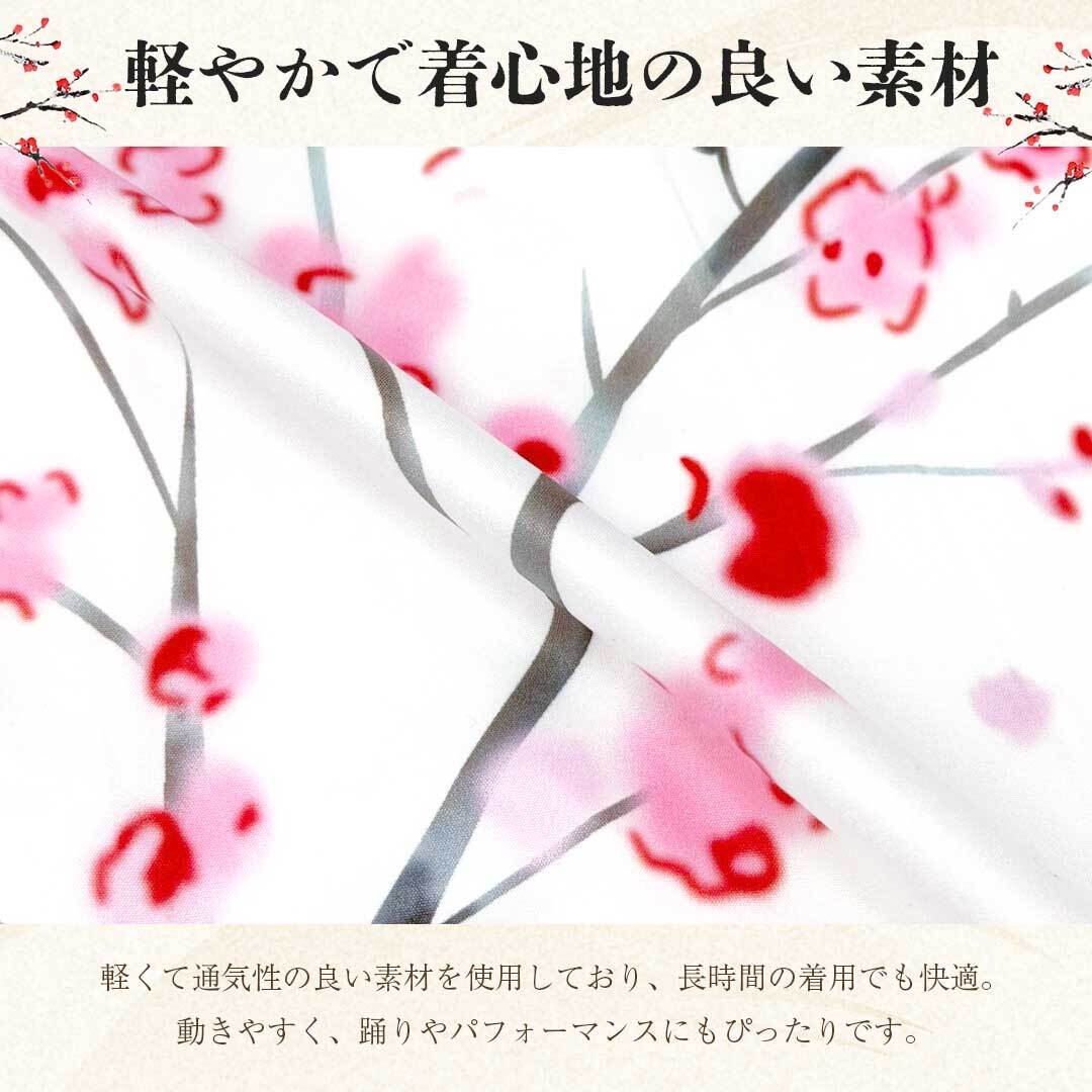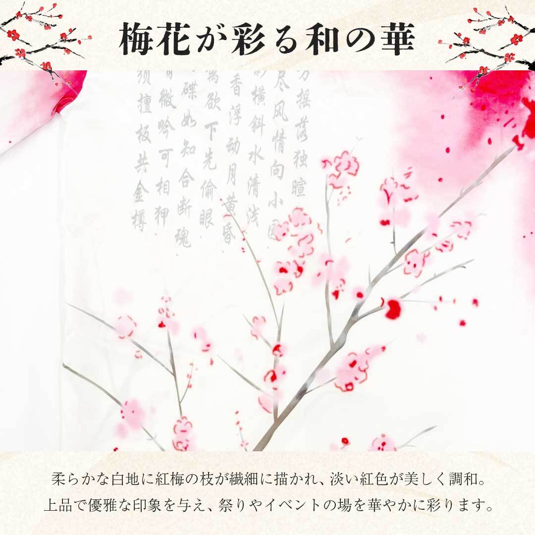 白地に紅梅の枝が繊細に広がり、淡い紅色のグラデーションが美しく溶け込むデザイン。背面には古詩を思わせる文字が配され、まるで水墨画のような静謐で芸術的な一着。祭りやイベント、盆踊り、学園祭、ダンスや舞台演出など、さまざまな場面で華やかに映える和装スタイルの羽織です。
